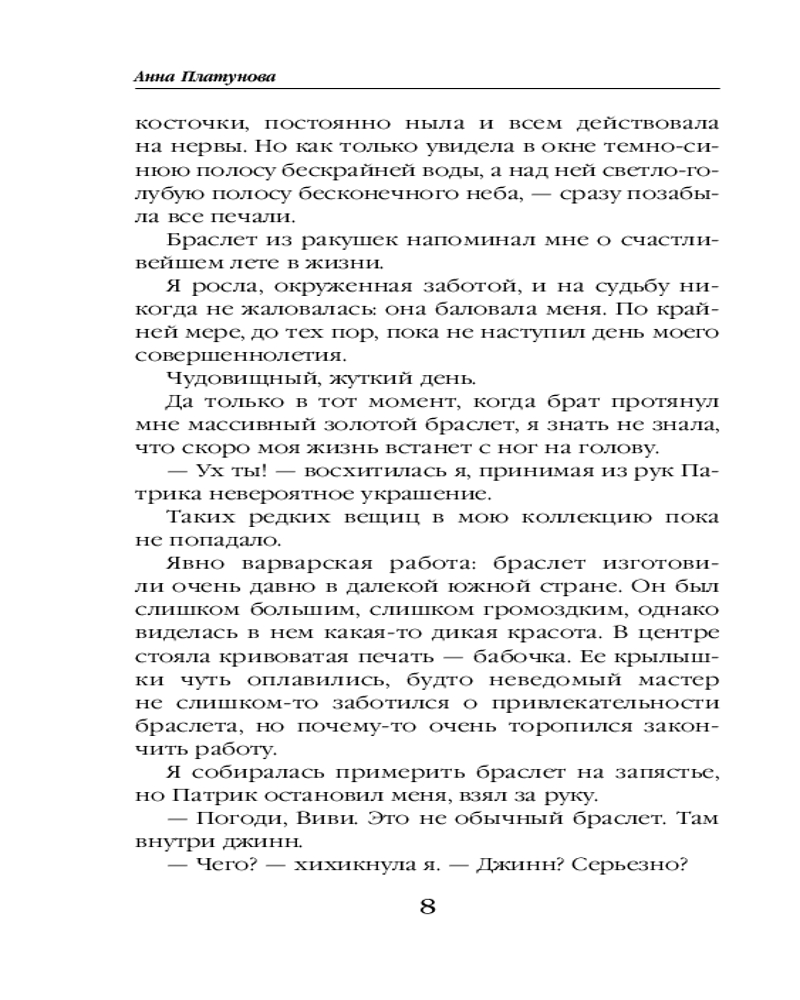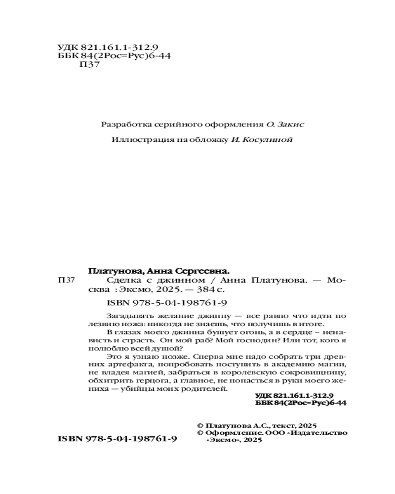 💳 Оплатить за товар можно при получении 🇰🇿 Есть бесплатная доставка по Казахстану 🎁 Копите бонусы с каждой покупки Серия: Колдовские миры Анны Платуновой. Новое оформление Чтобы спасти свою семью, я решилась на отчаянный шаг и заключила сделку с джинном. Загадывать желание джинну все равно что идти по лезвию ножа: никогда не знаешь, что получишь в итоге, ведь джинны коварны и злы на весь человеческий род. |