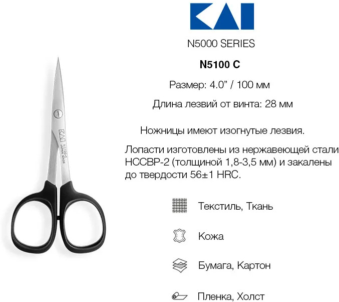 Вышивальные ножницы KAI 5100C (10 см) отличаются тончайшими загнутыми кончиками, которые не повредят вышивку при обрезке нитей и проникают в самые труднодоступные места. Лезвия выполнены из нержавеющей стали AUS6A (толщиной 1,8-3,5 мм) и твёрдостью металла 56 +/-1 по шкале Роквелла. Размер лезвий 100 мм/4″.