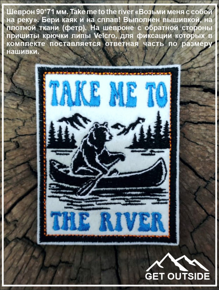 Шеврон 90×71 мм «Take me to the river» — «Возьми мена на реку». Выполнен вышивкой на плотной ткани (фетр). На шевроне с обратной стороны пришиты крючки липы Velcro, для фиксации которых в комплекте поставляется ответная часть по размеру нашивки. |