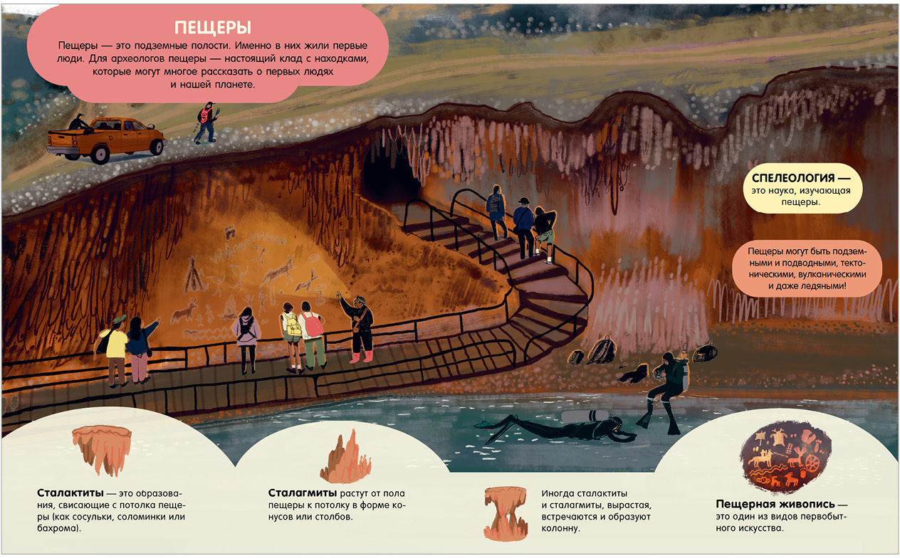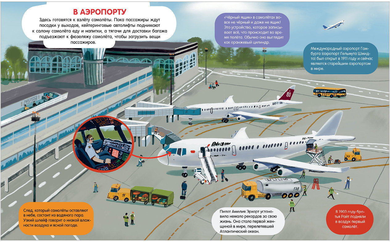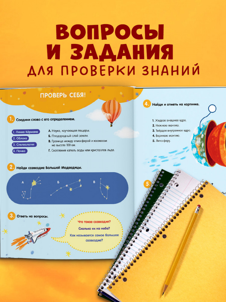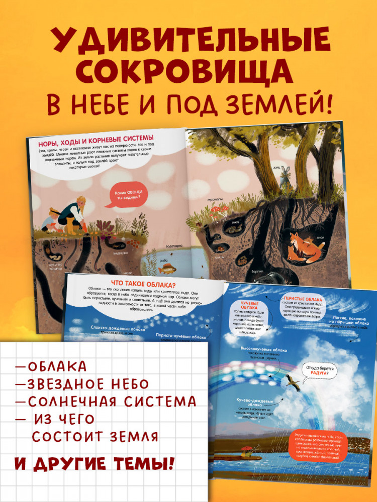 Открывайте книгу и отправляйтесь в познавательное путешествие: взгляните в небо, рассмотрите облака и звезды, поднимитесь между Землей и космосом. В небе летают не только птицы, но и самолеты — узнайте, когда первый из них поднялся в воздух, побывайте в аэропорту и в кабине пилота. Под землей тоже немало интересного: норы и ходы, в которых живут удивительные животные, пещеры, стены которых хранят рисунки древних людей… А если взглянуть еще глубже, в самый центр Земли?