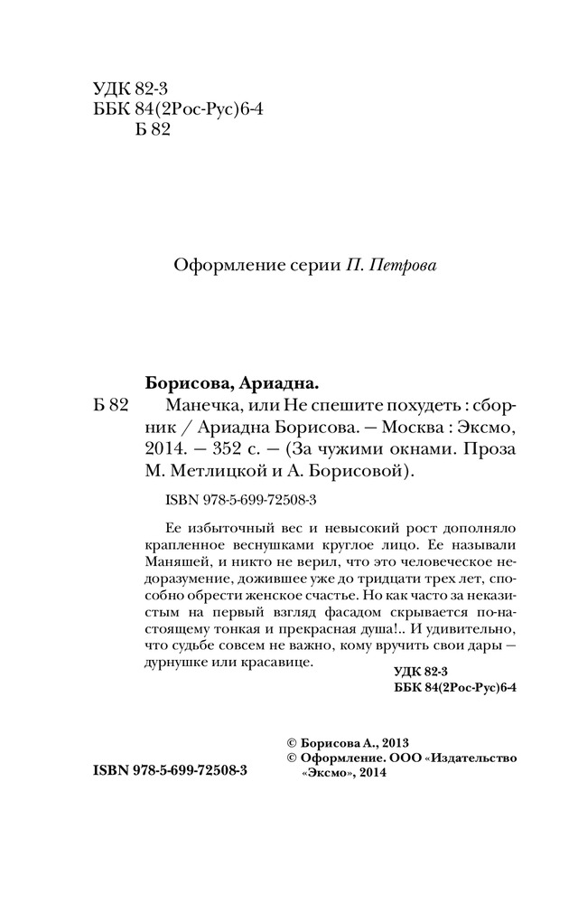 Манечка, или Не спешите похудетьВ данный момент этот товар отсутствует в продаже. Возможно, у нас найдется аналогичный или похожий товар здесь. Серия: За чужими окнами. Проза М. Метлицкой и А. Борисовой Ее избыточный вес и невысокий рост дополняло крапленое веснушками круглое лицо. Ее называли Маняшей, и никто не верил, что это человеческое недоразумение, дожившее уже до тридцати трех лет, способно обрести женское счастье. Но как часто за неказистым, на первый взгляд, фасадом скрывается по-настоящему тонкая и прекрасная душа!.. И удивительно, что судьбе совсем не важно, кому вручить свои дары - дурнушке или красавице. |
