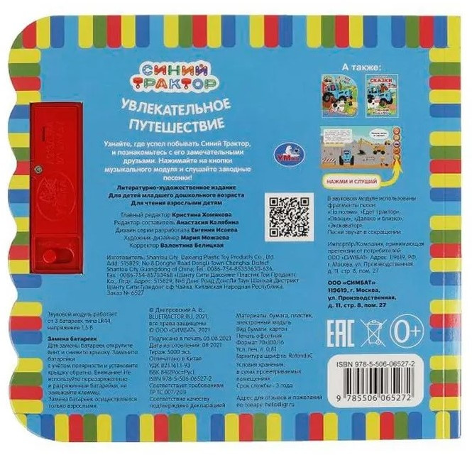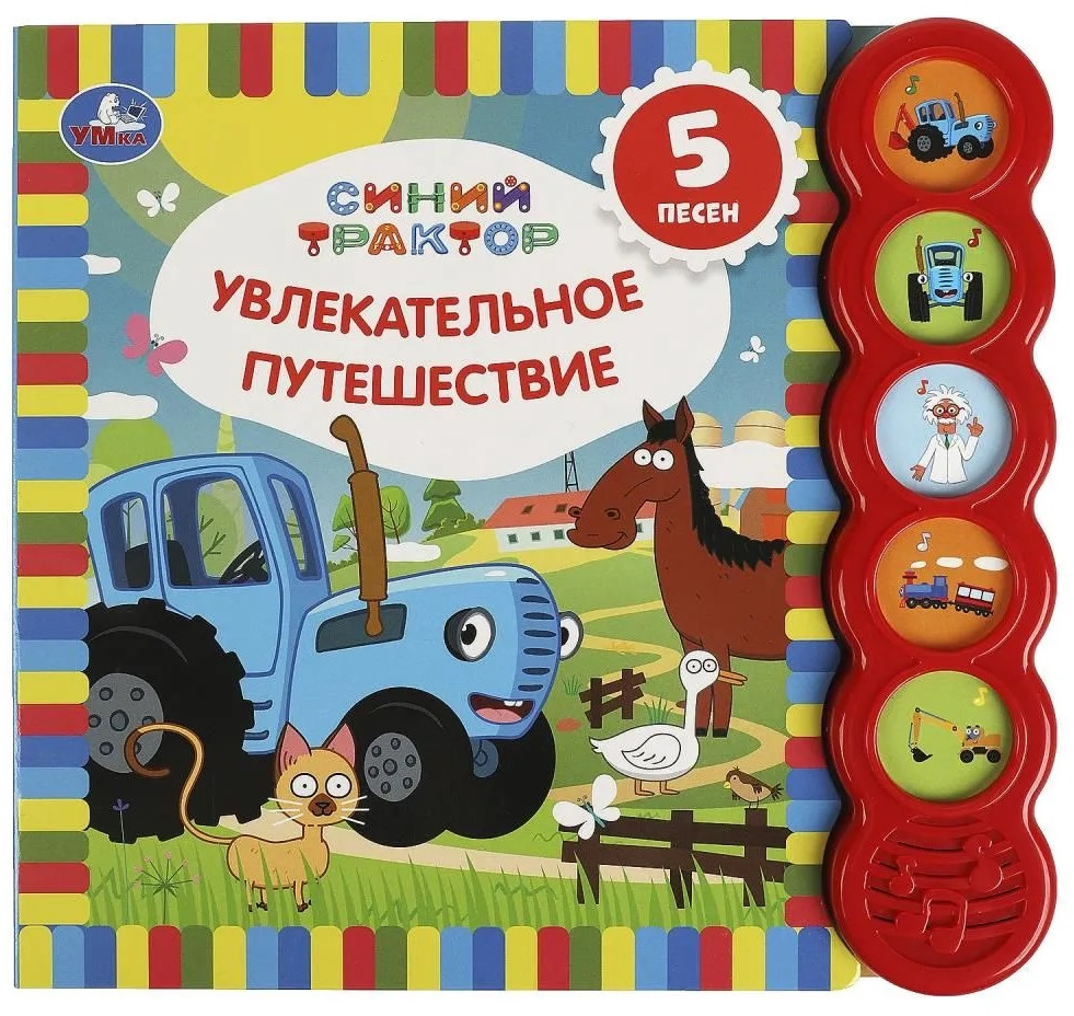 УМка Книга музыкальная «Увлекательное путешествие»В данный момент этот товар отсутствует в продаже. Возможно, у нас найдется аналогичный или похожий товар здесь. Серия: Синий трактор Музыкальная книга «Увлекательное путешествие» из серии «Синий Трактор» ТМ «УМка» станет отличным подарком для малыша. Ребёнок с удовольствием будет листать плотные страницы, рассматривать яркие картинки, вместе с родителями читать о приключениях героев любимого мультсериала и, конечно, нажимать на кнопки и слушать весёлые песенки. Малыш легко освоит включение звука: по нажатию на кнопку песенка включится, при втором нажатии выключится. Благодаря компактному размеру книгу удобно взять с собой в дорогу. Музыкальная книга ТМ «УМка» расширяет кругозор и развивает: слуховое восприятие, навык чтения, фантазию, образное мышление, память и моторику. |