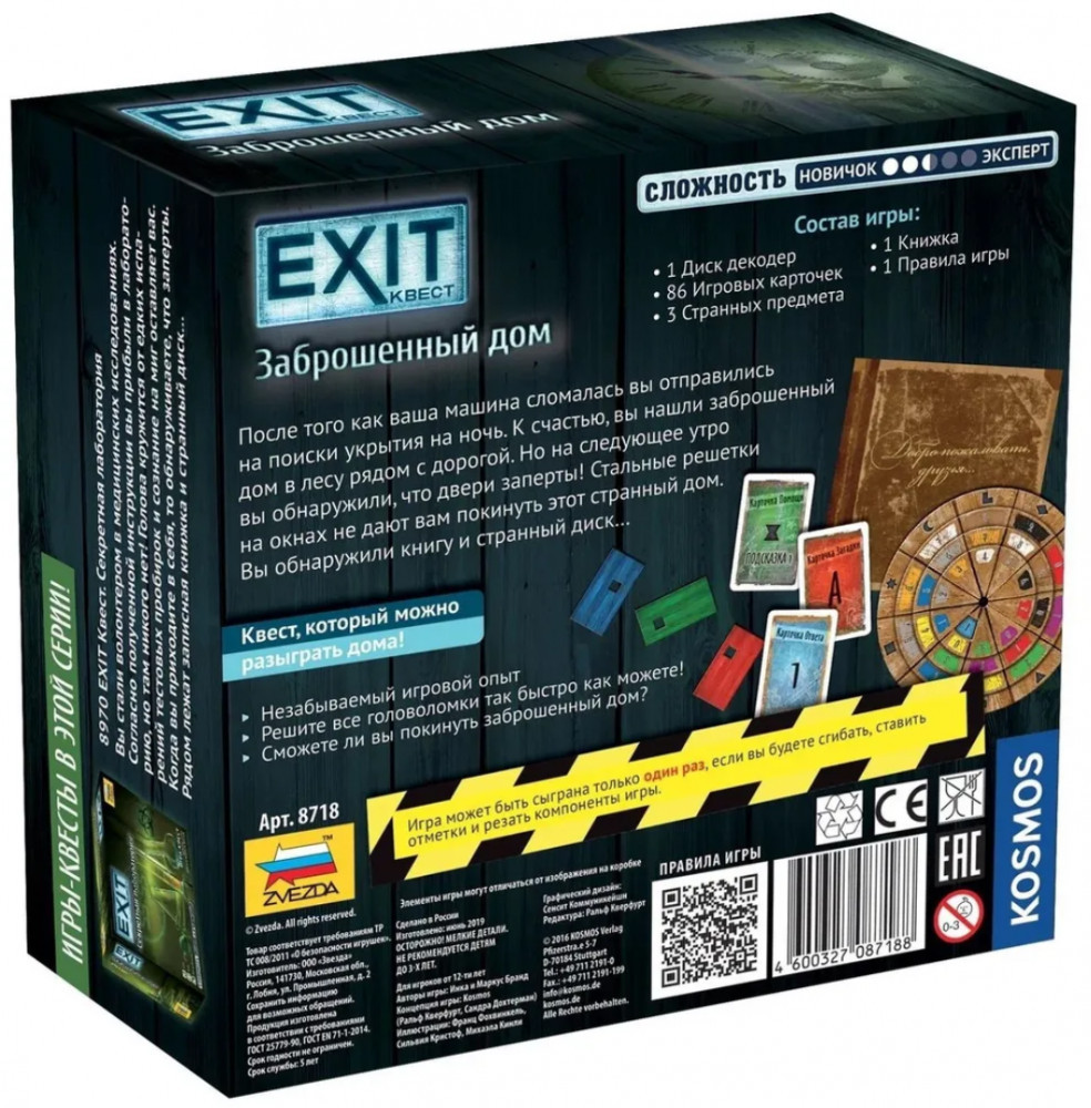 Серия: Exit-квест После того, как ваша машина сломалась, вы отправились на поиски укрытия на ночь. К счастью, вы нашли заброшенный дом в лесу рядом с дорогой. Но на следующее утро вы не могли открыть двери! Стальные решётки на окнах не дают вам покинуть странный дом. Кажется, что выхода нет! Вы обнаружили книгу и странный диск... и начинается Игра! |