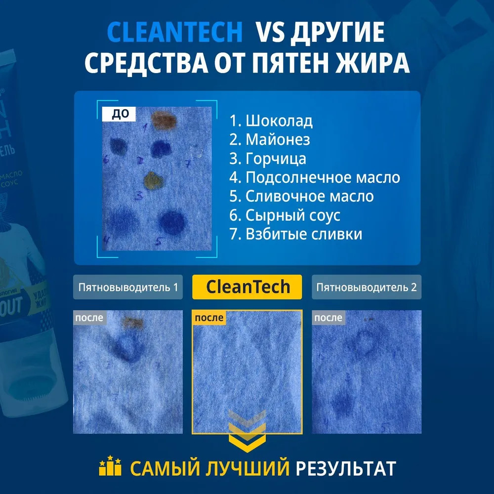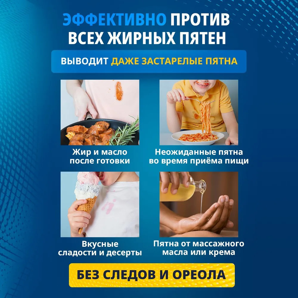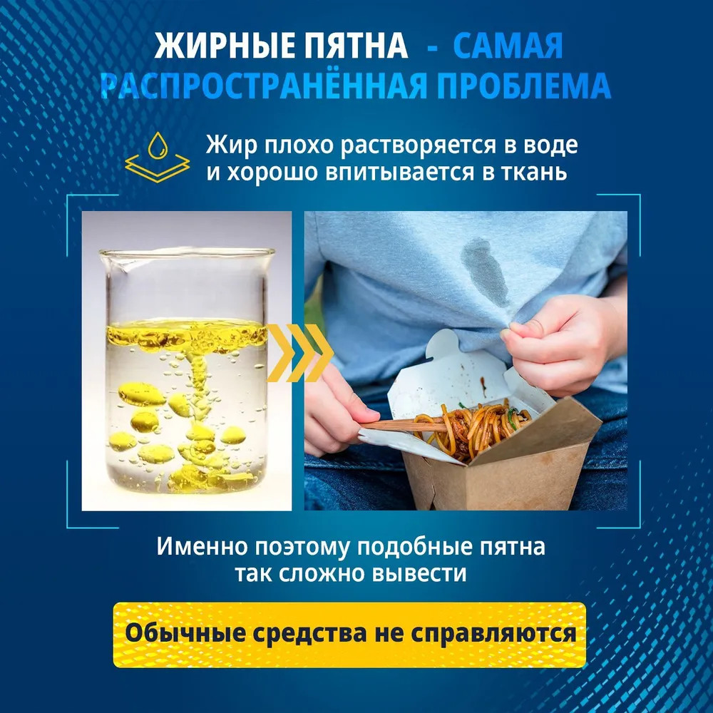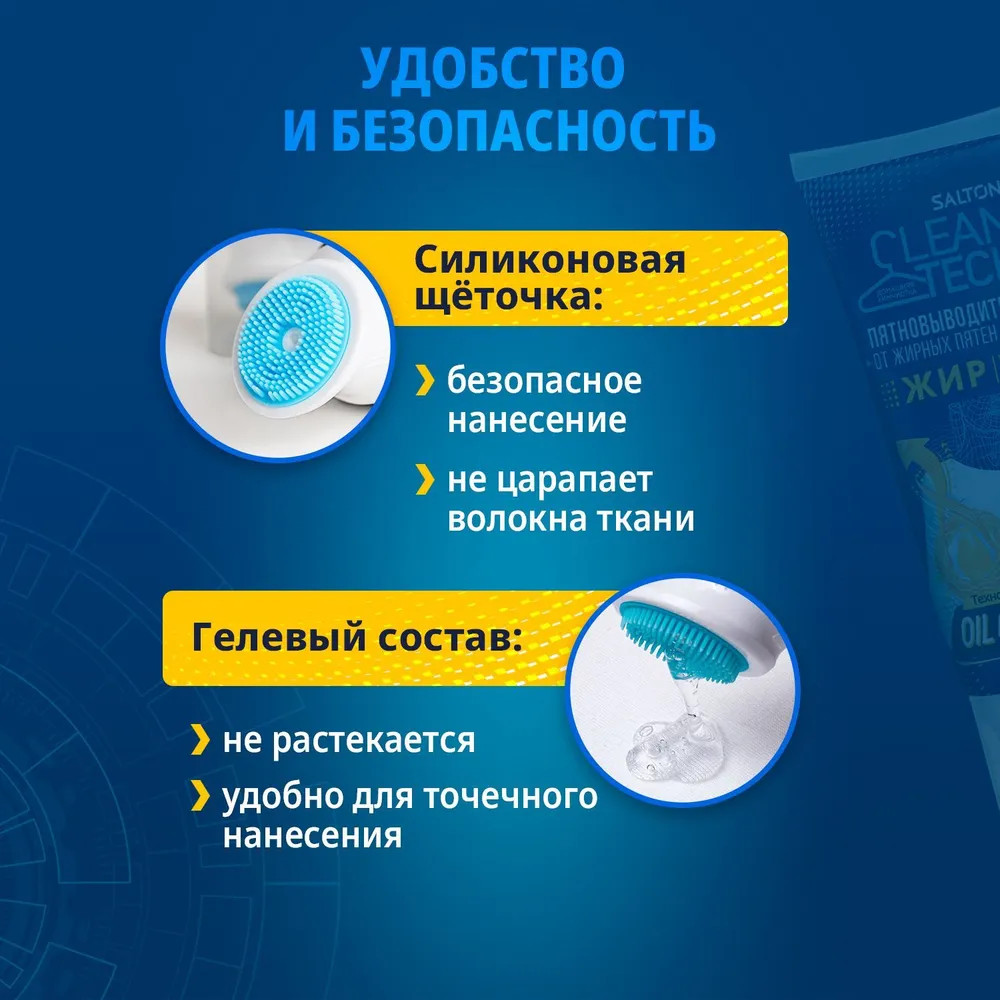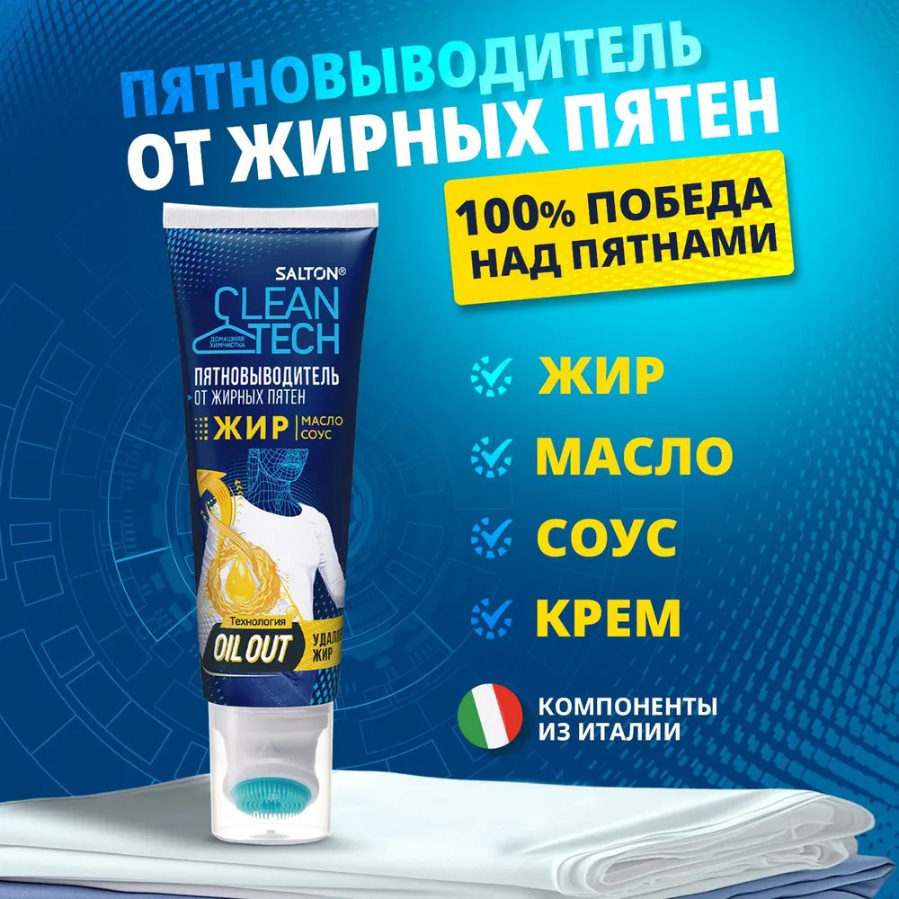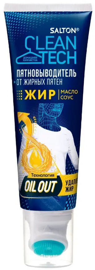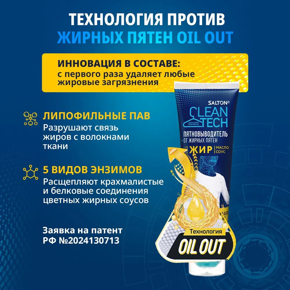 Жирные пятна являются одними из самых распространенных типов загрязнений. Это проблема, с которой сталкивается абсолютно каждый. С кем не бывало — брызг от масла на любимой блузке во время приготовления ужина или упрямое пятно от жирного соуса на джинсах? Жир плохо растворяется в воде и хорошо впитывается в ткань. Именно поэтому подобные пятна так сложно вывести. Обычные пятновыводители могут воздействовать на жирное пятно, но, как правило, они не удаляют его до конца, остается ореол. Специально для подобных пятен мы разработали высокоэффективный пятновыводитель Salton CleanTech от жирных пятен, для удаления загрязнений различного происхождения: жир, соус, масло, крем и т.п. Инновационная технология Oil-Out содержит в себе липофильные ПАВ, которые разрушают связь жиров с волокнами ткани, а 5 энзимов расщепляют крахмалистые и белковые соединения цветных и жировых соусов. Благодаря такому уникальному составу жиры и масла легко вымываются с ткани, не оставляя следа. Выводит даже застарелые пятна.