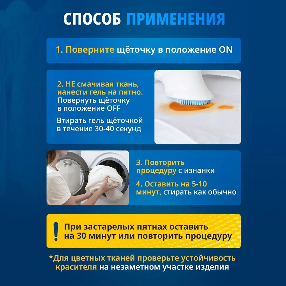 Средство не повреждает одежду и не меняет цвет ткани. Подходит для всех типов цветных и белых тканей, кроме шерсти и шелка. Удобный аппликатор c силиконовой щеточкой для точечной обработки позволяет экономить средство и делает его использование максимально комфортным. С его помощью процесс стирки становится быстрым и комфортным, а ваша одежда — идеально чистой. Не содержит хлора, красителей и ароматизаторов.