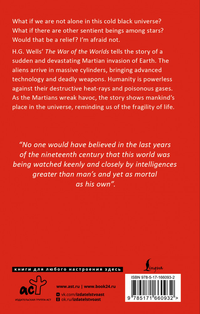 Серия: Exclusive Classics Paperback Мечтаете выучить язык инопланетян? Начните с английского! «Война миров» Герберта Уэллса поможет вам, и заодно объяснит, почему стоит опасаться таинственных пришельцев. Герберт Уэллс был по-настоящему талантливым писателем, визионером. Его книги во многом предсказали будущее. «Война миров» — один из первых его романов, и один из наиболее известных. Речь в нем идет о столкновении цивилизаций: земной и марсианской, которая оказалась не такой уж дружелюбной. Роман справедливо занял одно из первых мест в пантеоне научной фантастики. Текст издан без сокращений и адаптации. Наслаждайтесь визионерским гением Герберта Уэллса в оригинале! |