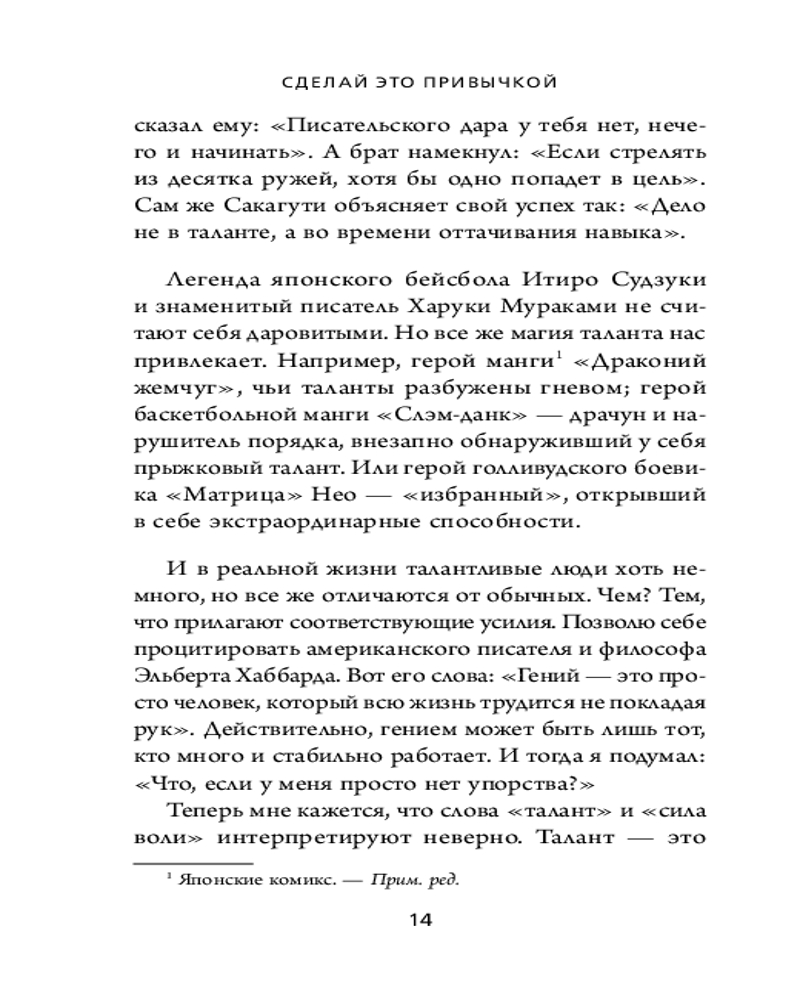 Сделай это привычкой. Как отточить любой навык с помощью 50 простых шаговВ данный момент этот товар отсутствует в продаже. Возможно, у нас найдется аналогичный или похожий товар здесь. Серия: Книги, о которых говорят Можно ли стать известным и добиться признания, если не обладаешь особыми талантами? Фумио Сасаки, соредактор Wani Books и автор бестселлеров, считает, что да. Дело не в таланте, а во времени оттачивания навыка. На страницах своей книги он рассказывает, как выработать полезные привычки и преобразить свою жизнь всего за 50 шагов. |