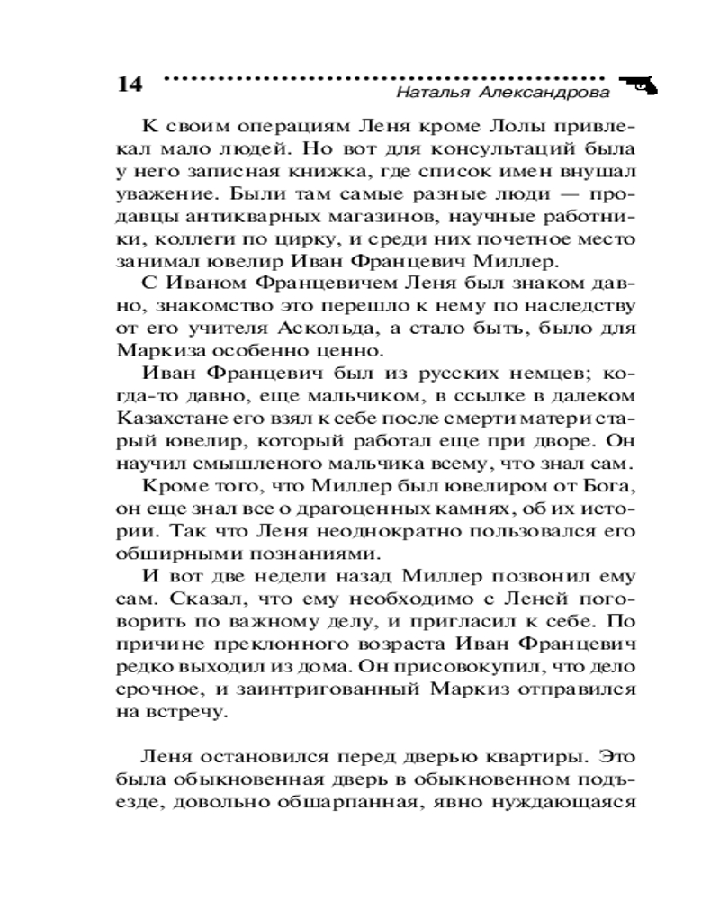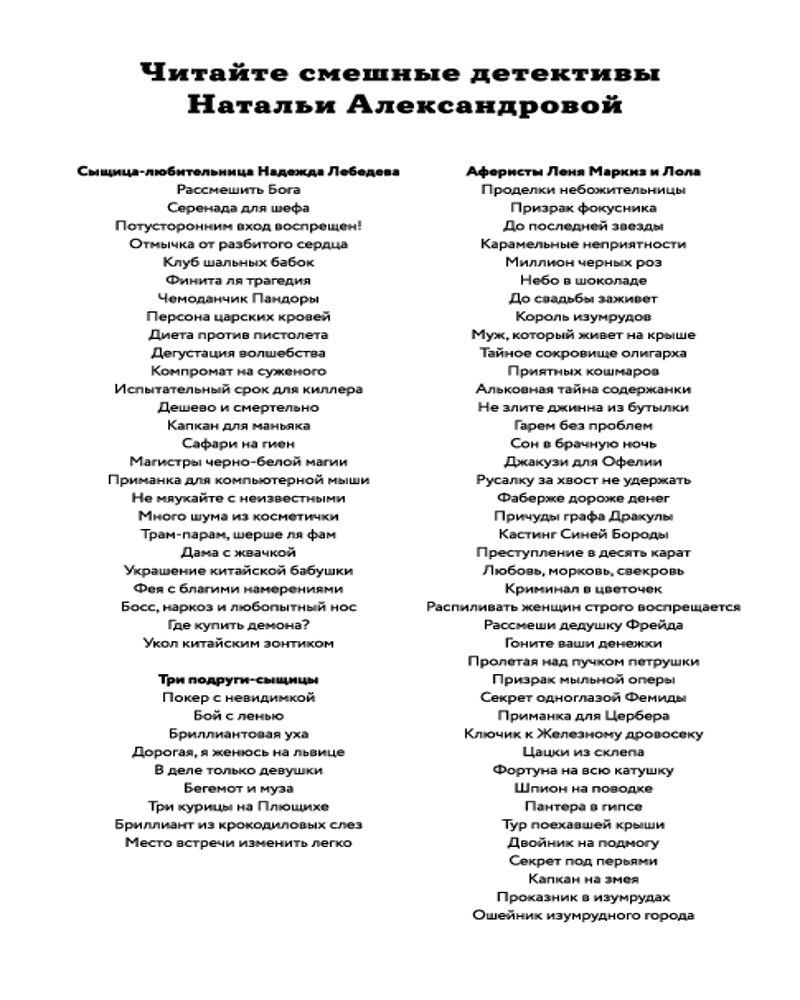 Серия: Смешные детективы. Новое оформление (обложка) «Слово клиента — закон», — всегда полагал известный ювелир Миллер, привыкший к капризам богатых заказчиков. Но каково же было его удивление, когда удивительной красоты изумруд клиентка попросила вставить не в кольцо, не в колье, не даже в диадему, а в... собачий ошейник. Она так обожала своего песика, что даже похоронить его решила с бесценным украшением. Но когда Миллер увидел тот самый изумруд среди драгоценностей одной светской дамы, он испытал двойной шок. Только знаменитому аферисту и специалисту по щекотливым делам Лене Маркизу и его бессменной помощнице Лоле по плечу это сложнейшее дело. А для того, чтобы выяснить, куда делся драгоценный ошейник, им придется заглянуть в кладбищенский склеп и потревожить его обитателей... |
