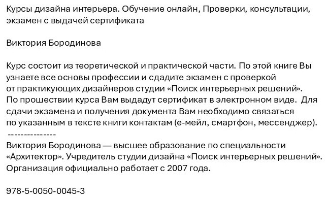 Курсы дизайна интерьера. Обучение онлайн. Проверки, консультации, экзамен с выдачей сертификатаВ данный момент этот товар отсутствует в продаже. Возможно, у нас найдется аналогичный или похожий товар здесь. Курс состоит из теоретической и практической части. По этой книге Вы узнаете все основы профессии и сдадите экзамен с проверкой от практикующих дизайнеров студии «Поиск интерьерных решений». Автор: Виктория Бородинова. |