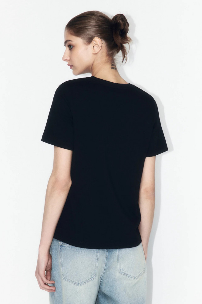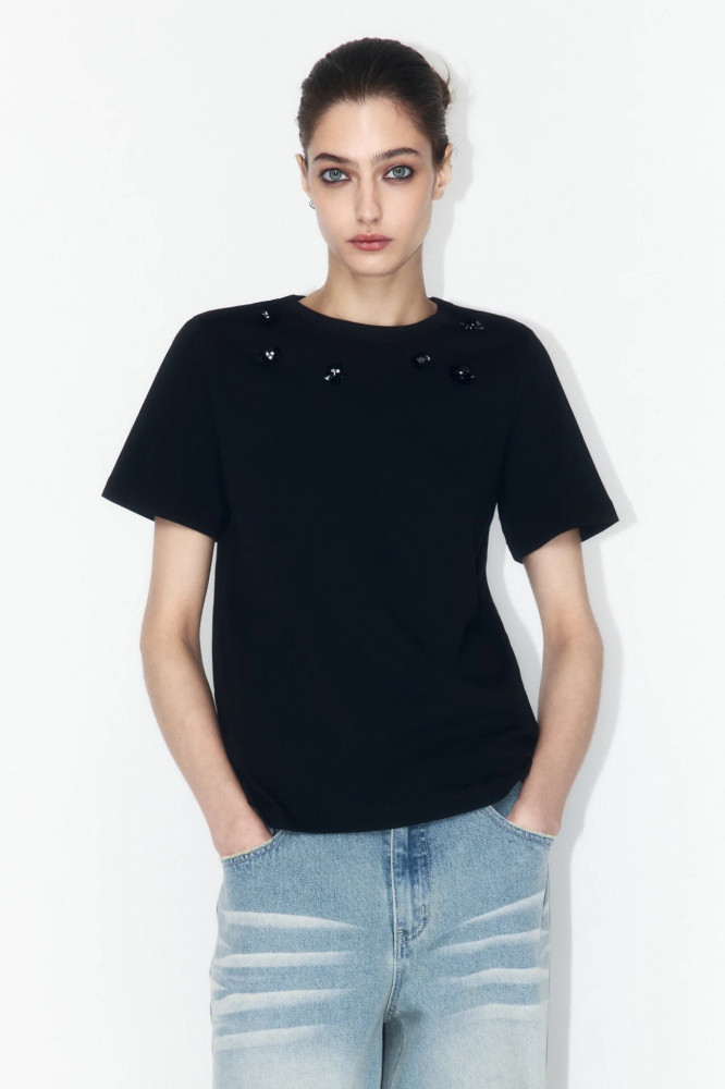 Легкая футболка с блестящими цветами из новой весенней коллекции внесет приятное разнообразие в твои строгие аутфиты на учебу, в офис и просто на каждый день. Для официальных сдержанных образов носи ее с классическим низом, дополняя жакетами или кардиганами из новой коллекции Befree. Создавай с хлопковой футболкой с пайетками трендовые образы в английской эстетике, сочетая ее с грубым выстиранным денимом или классическими костюмными сетами.