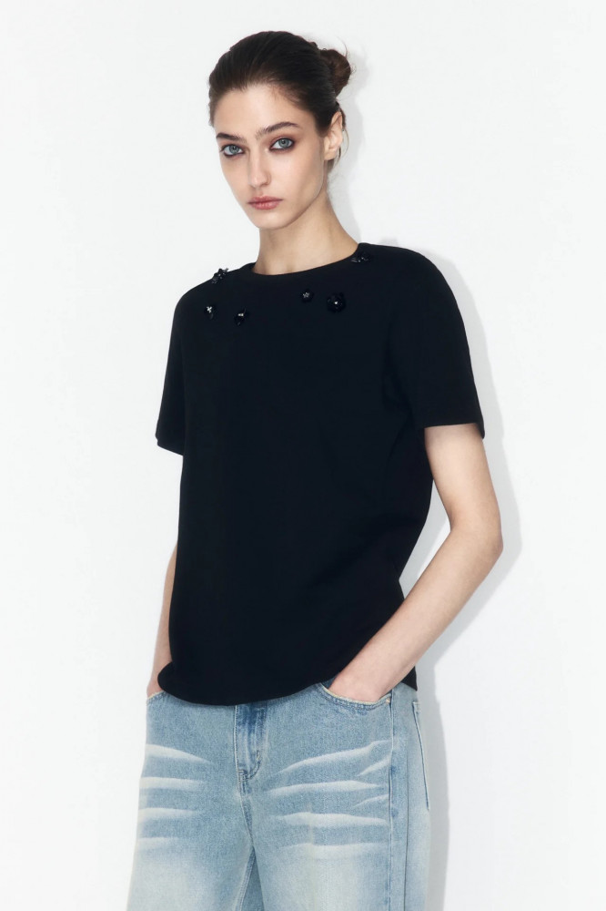 Женская футболка прямого кроя из плотной, мягкой 100% хлопковой ткани с трикотажной фактурой. Круглый вырез горловины без воротника. Короткие рукава выше локтя с прямой линией плеча. Прямой нижний без разрезов. Декоративные цветы из пайеток на груди.