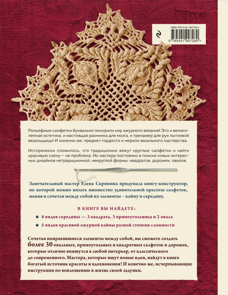 Ажурные рельефные салфетки. Вязание крючком. Комплект из 2 книгВ данный момент этот товар отсутствует в продаже. Возможно, у нас найдется аналогичный или похожий товар здесь. Серия: Русская школа вязания Рельефные салфетки буквально покорили мир ажурного вязания! Это и великолепная эстетика, и настоящая разминка для мозга, и тренажер для рук пытливой вязальщицы! И конечно же, предмет гордости и мерило вязального мастерства. Исторически сложилось, что традиционно вяжут круглые салфетки, и найти красивую схему — не проблема. Но мастера постоянно находятся в поиске новых интересных дизайнов нетрадиционной, некруглой формы: квадратов, дорожек, овалов. Забудьте о разочаровании, когда изысканные узоры из книг и журналов кажутся недостижимыми из-за своей сложности и запутанности. |