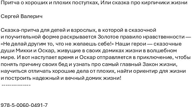 Притча о хороших и плохих поступках или сказка про кирпичики жизниВ данный момент этот товар отсутствует в продаже. Возможно, у нас найдется аналогичный или похожий товар здесь. Сказка-притча для детей и взрослых, в которой в сказочной и поучительной форме раскрывается Золотое правило нравственности — Не делай другим то, что не желаешь себе! Наши герои — сказочные души Микки и Оскар, живущие в своих домиках жизни в волшебном мире. И вот наступает время и Оскар отправляется в приключение, чтобы понять причину своих бед и узнать про самый главный Закон жизни, научиться отличать хорошие дела от плохих, найти ориентир для жизни и построить надежный и вечный домик жизни! |