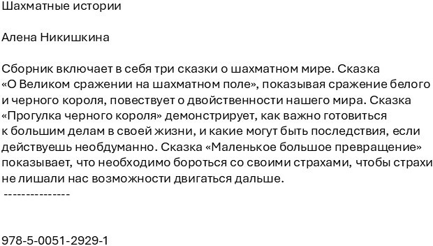 Шахматные историиВ данный момент этот товар отсутствует в продаже. Возможно, у нас найдется аналогичный или похожий товар здесь. Сборник включает в себя три сказки о шахматном мире. Сказка «О Великом сражении на шахматном поле», показывая сражение белого и черного короля, повествует о двойственности нашего мира. Сказка «Прогулка черного короля» демонстрирует, как важно готовиться к большим делам в своей жизни, и какие могут быть последствия, если действуешь необдуманно. Сказка «Маленькое большое превращение» показывает, что необходимо бороться со своими страхами, чтобы страхи не лишали нас возможности двигаться дальше. |