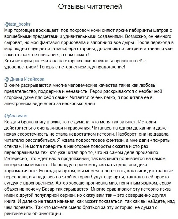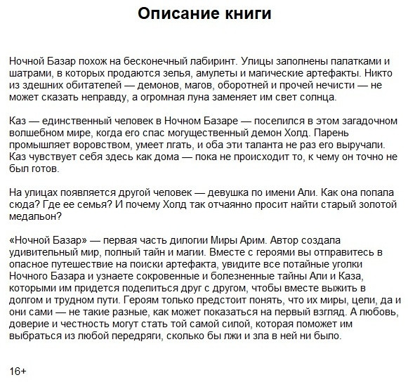 «Ночной Базар» — первая часть дилогии Миры Арим. Автор создала удивительный мир полный тайн и магии. Вместе с героями вы отправитесь в опасное путешествие на поиски артефакта увидите все потайные уголки Ночного Базара и узнаете сокровенные и болезненные тайны Али и Каза которыми им придется поделиться друг с другом чтобы вместе выжить в долгом и трудном пути. Героям только предстоит понять что их миры цели да и они сами — не такие разные как может показаться на первый взгляд. А любовь доверие и честность могут стать той самой силой которая поможет им выбраться из любой передряги сколько бы лжи и зла в ней ни было. |