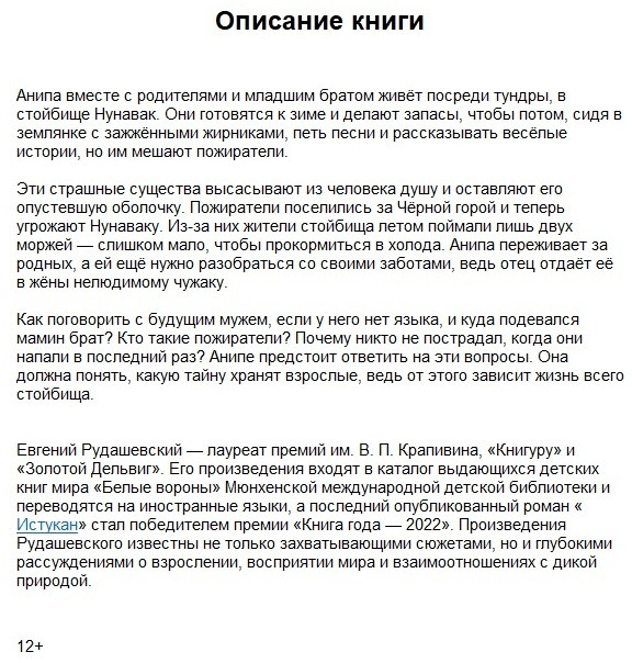 В данный момент этот товар отсутствует в продаже. Возможно, у нас найдется аналогичный или похожий товар здесь. Анипа вместе с родителями и младшим братом живёт посреди тундры в стойбище Нунавак. Они готовятся к зиме и делают запасы чтобы потом сидя в землянке с зажжёнными жирниками петь песни и рассказывать весёлые истории. Но им мешают пожиратели. Эти страшные существа высасывают из человека душу и оставляют его опустевшую оболочку. Пожиратели поселились за Чёрной горой и теперь угрожают Нунаваку. Из-за них жители стойбища летом поймали лишь двух моржей — слишком мало чтобы прокормиться в холода. Анипа переживает за родных а ей ещё нужно разобраться со своими заботами ведь отец отдаёт её в жёны нелюдимому чужаку. Как поговорить с будущим мужем если у него нет языка и куда подевался мамин брат? Кто такие пожиратели? Почему никто не пострадал когда они напали в последний раз? Анипе предстоит ответить на эти вопросы. Она должна понять какую тайну хранят взрослые ведь от этого зависит жизнь всего стойбища. Евгений Рудашевский — лауреат премий им. В. П. Крапивина «Книгуру» и «Золотой Дельвиг». Его произведения входят в каталог выдающихся детских книг мира «Белые вороны» Мюнхенской международной детской библиотеки и переводятся на иностранные языки а последний опубликованный роман «Истукан» стал победителем премии «Книга года — 2022». Произведения Рудашевского известны не только захватывающими сюжетами но и глубокими рассуждениями о взрослении восприятии мира и взаимоотношениях с дикой природой. |