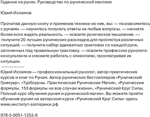 Гадание на рунах. Руководство по рунической мантикеВ данный момент этот товар отсутствует в продаже. Возможно, у нас найдется аналогичный или похожий товар здесь. Эта книга – ваш проводник в мир рун, который поможет не только познакомиться с древними символами, но и научиться применять их в повседневной жизни. Вы освоите методики гадания, толкования и разовьёте руническое мышление. На её страницах вы найдёте 20 лучших раскладов для анализа различных ситуаций, получите точные трактовки каждой руны и научитесь получать ответы на любые вопросы. Книга даст вам возможность яснее видеть реальность, глубже понимать происходящее и даже освоить профессию рунолога-консультанта, чтобы работать с клиентами и помогать им разбираться в жизненных ситуациях. Подходящая как для новичков, так и для тех, кто хочет углубить свои знания, она станет практическим руководством на пути к пониманию рун и их силы. |