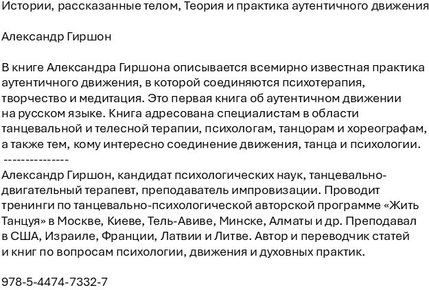 Истории, рассказанные телом. Теория и практика аутентичного движенияВ данный момент этот товар отсутствует в продаже. Возможно, у нас найдется аналогичный или похожий товар здесь. В книге Александра Гиршона описывается всемирно известная практика аутентичного движения, в которой соединяются психотерапия, творчество и медитация. Это первая книга об аутентичном движении на русском языке. Книга адресована специалистам в области танцевальной и телесной терапии, психологам, танцорам и хореографам, а также тем, кому интересно соединение движения, танца и психологии. |