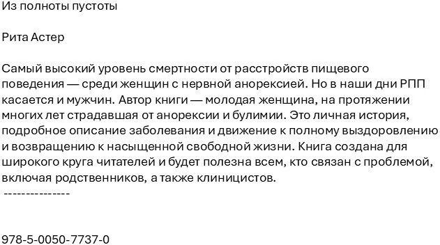 Из полноты пустотыВ данный момент этот товар отсутствует в продаже. Возможно, у нас найдется аналогичный или похожий товар здесь. Самый высокий уровень смертности от расстройств пищевого поведения — среди женщин с нервной анорексией. Но в наши дни РПП касается и мужчин. Автор книги — молодая женщина, на протяжении многих лет страдавшая от анорексии и булимии. Это личная история, подробное описание заболевания и движение к полному выздоровлению и возвращению к насыщенной свободной жизни. Книга создана для широкого круга читателей и будет полезна всем, кто связан с проблемой, включая родственников, а также клиницистов. |
