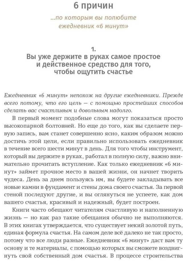 6 минут. Ежедневник, который изменит вашу жизньВ данный момент этот товар отсутствует в продаже. Возможно, у нас найдется аналогичный или похожий товар здесь. Серия: Ежедневники «6 минут» Счастье не является результатом везения или случайного стечения обстоятельств. Стать счастливым помогают правильные установки и образ мыслей. 3 минуты утром и 3 минуты вечером — столько времени займет выработка полезных привычек, которые сделают вашу жизнь осознаннее, гармоничнее, а значит — счастливее. |