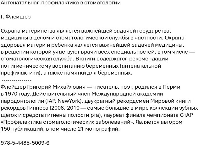 Охрана материнства является важнейшей задачей государства, медицины в целом и стоматологической службы в частности. Охрана здоровья матери и ребенка является важнейшей задачей медицины, в решении которой участвуют врачи всех специальностей, в том числе — стоматологическая служба. В книги содержатся рекомендации по гигиеническому воспитанию беременных (антенатальной профилактики), а также памятки для беременных.