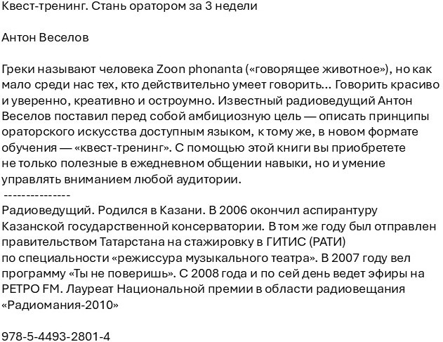 Квест-тренинг. Стань оратором за 3 неделиВ данный момент этот товар отсутствует в продаже. Возможно, у нас найдется аналогичный или похожий товар здесь. Греки называют человека Zoon phonanta («говорящее животное»), но как мало среди нас тех, кто действительно умеет говорить… Говорить красиво и уверенно, креативно и остроумно. Известный радиоведущий Антон Веселов поставил перед собой амбициозную цель — описать принципы ораторского искусства доступным языком, к тому же, в новом формате обучения — «квест-тренинг». С помощью этой книги вы приобретете не только полезные в ежедневном общении навыки, но и умение управлять вниманием любой аудитории. |