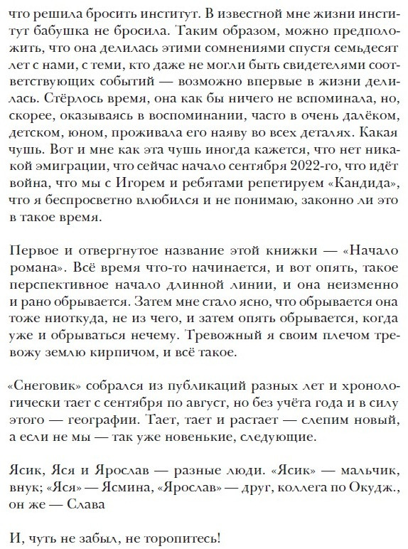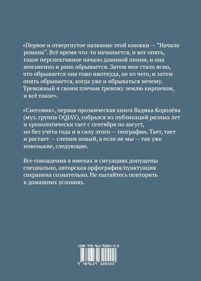 СнеговикВ данный момент этот товар отсутствует в продаже. Возможно, у нас найдется аналогичный или похожий товар здесь. «Снеговик», первая прозаическая книга Вадика Королёва (муз. группа OQJAV), собрана из публикаций разных лет и хронологически тает с сентября по август, но без учёта года и в силу этого — географии. Тает, тает и растает — слепим новый, а если не мы — так уже новенькие, следующие. Все совпадения в именах и ситуациях допущены специально, авторская орфография/пунктуация сохранена сознательно. Не пытайтесь повторить в домашних условиях. |
