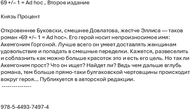 69 +/- 1 = Ad hocВ данный момент этот товар отсутствует в продаже. Возможно, у нас найдется аналогичный или похожий товар здесь. Откровеннее Буковски, смешнее Довлатова, жестче Эллиса — таков роман «69 +/- 1 = Ad hoc». Его герой носит непроизносимое имя: Акемгоним Горгоной. Лучше всего он умеет доставлять женщинам удовольствие и попадать в смешные переделки. Кажется, развеселить и соблазнить как можно больше красоток это и есть его цель. Но так ли Акемгоним прост? Что он ищет? Найдет ли? Ведь чем дальше вглубь романа, тем больше прямо-таки булгаковской чертовщины происходит вокруг героя... Публикуется в авторской редакции. |