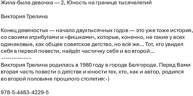 Жила-была девочка — 2. Юность на границе тысячелетийВ данный момент этот товар отсутствует в продаже. Возможно, у нас найдется аналогичный или похожий товар здесь. Конец девяностых — начало двухтысячных годов — это уже тоже история, со своими атрибутами и «фишками», которые, конечно, не такие у всех одинаковые, как общее советское детство, но всё же... Тот, кто увидел себя в первой повести, найдёт частичку себя и во второй... |