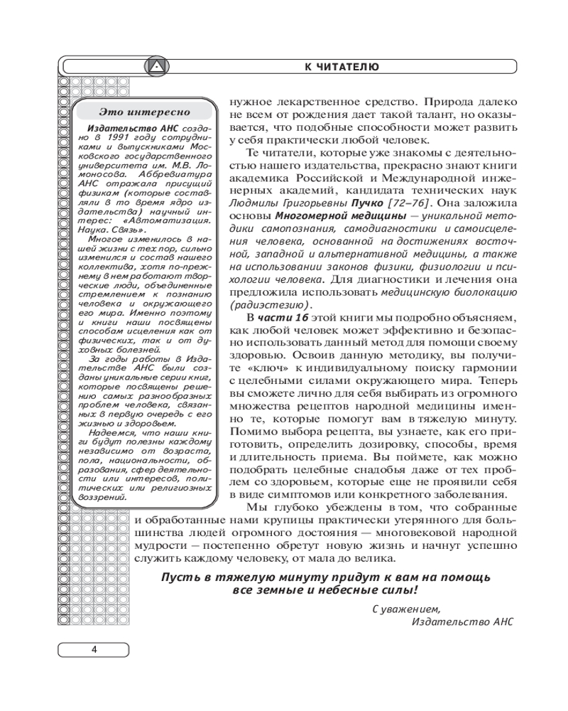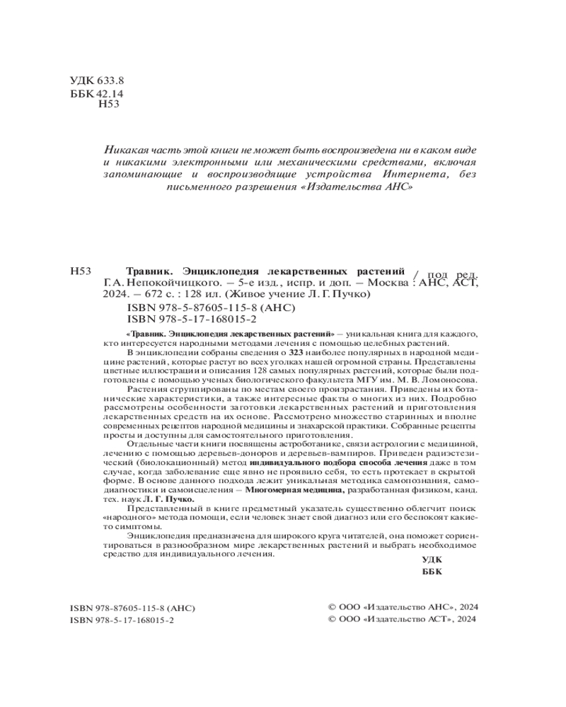 Серия: Живое учение Л.Г. Пучко «Энциклопедия лекарственных трав» — уникальная по своему содержанию и наполнению книга для тех, кто интересуется народными методами лечения различных заболеваний с помощью растений. В «Травнике» собраны сведения о целебных свойствах наиболее распространенных и известных лекарственных трав, кустарников и деревьев, произрастающих в самых разных условиях. |
