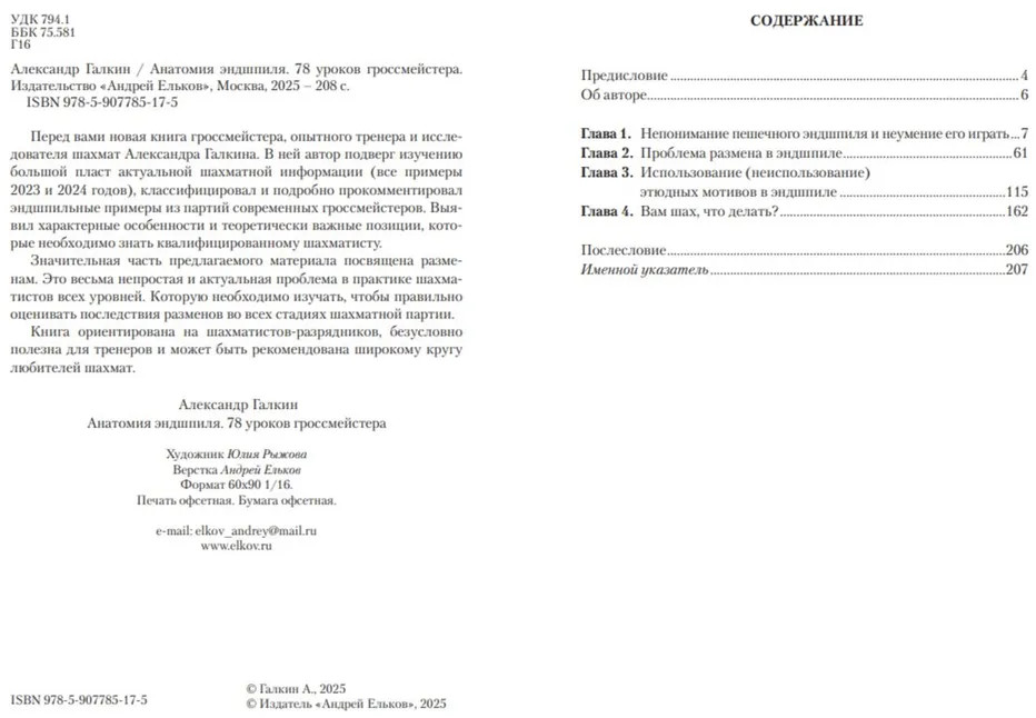 Перед вами новая книга гроссмейстера, опытного тренера и исследователя шахмат Александра Галкина. В ней автор подверг изучению большой пласт актуальной шахматной информации (все примеры 2023 и 2024 годов), классифицировал и подробно прокомментировал эндшпильные примеры из партий современных гроссмейстеров. Выявил характерные особенности и теоретически важные позиции, которые необходимо знать квалифицированному шахматисту. Значительная часть предлагаемого материала посвящена разменам. Это весьма непростая и актуальная проблема в практике шахматистов всех уровней. Которую необходимо изучать, чтобы правильно оценивать последствия разменов во всех стадиях шахматной партии. Книга ориентирована на шахматистов-разрядников, безусловно полезна для тренеров и может быть рекомендована широкому кругу любителей шахмат. |