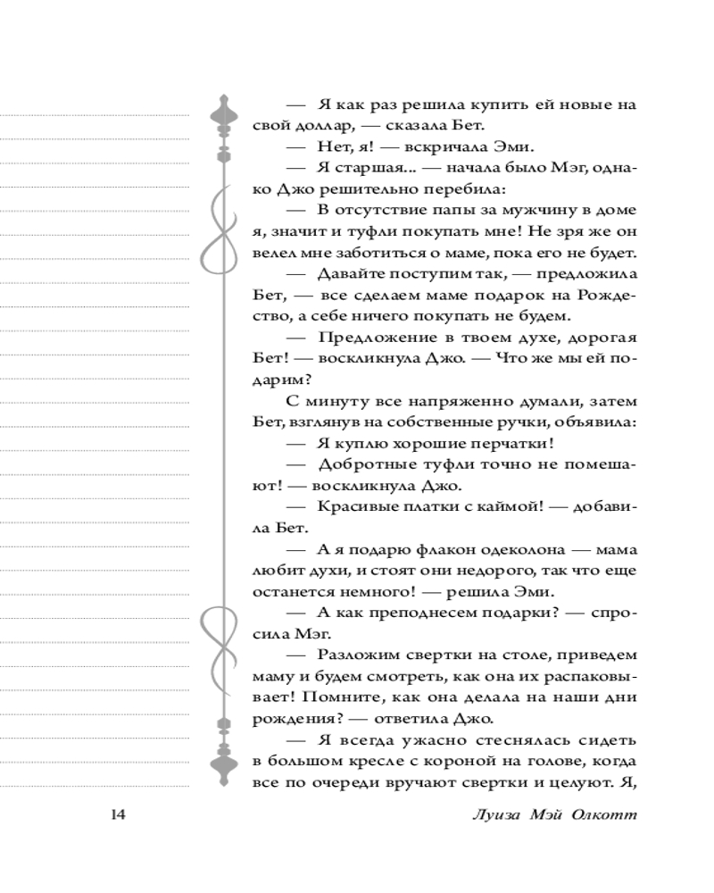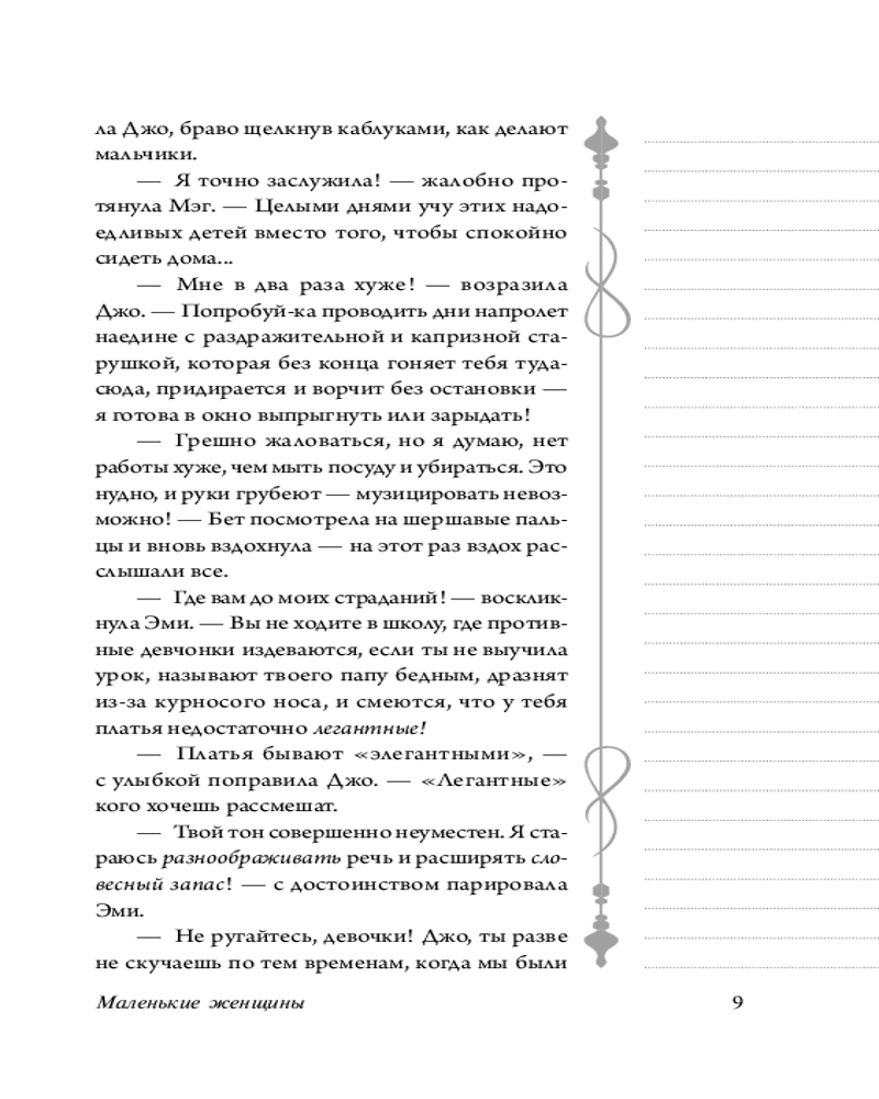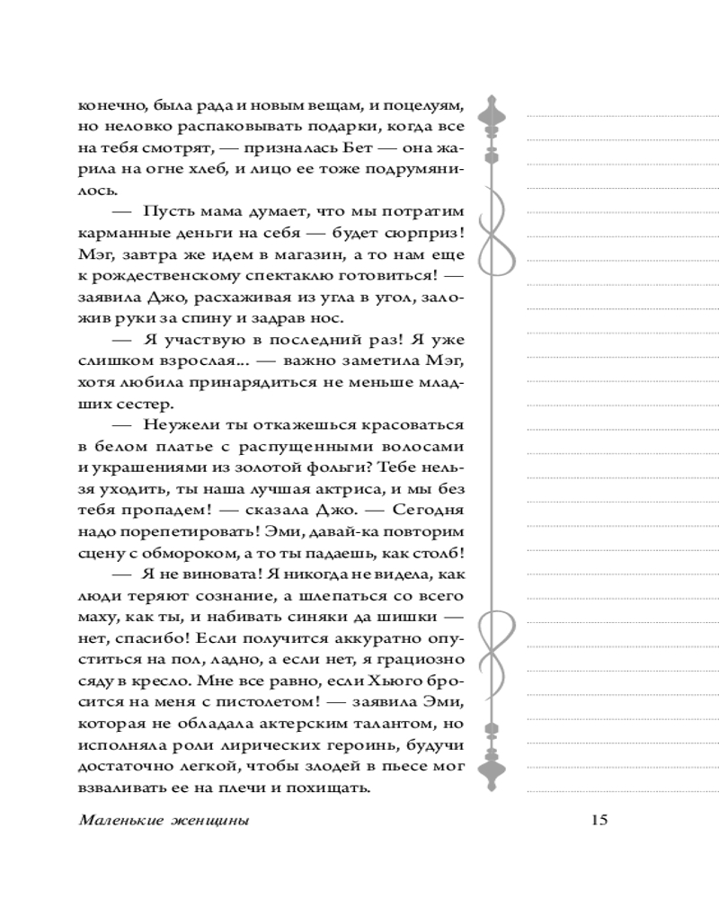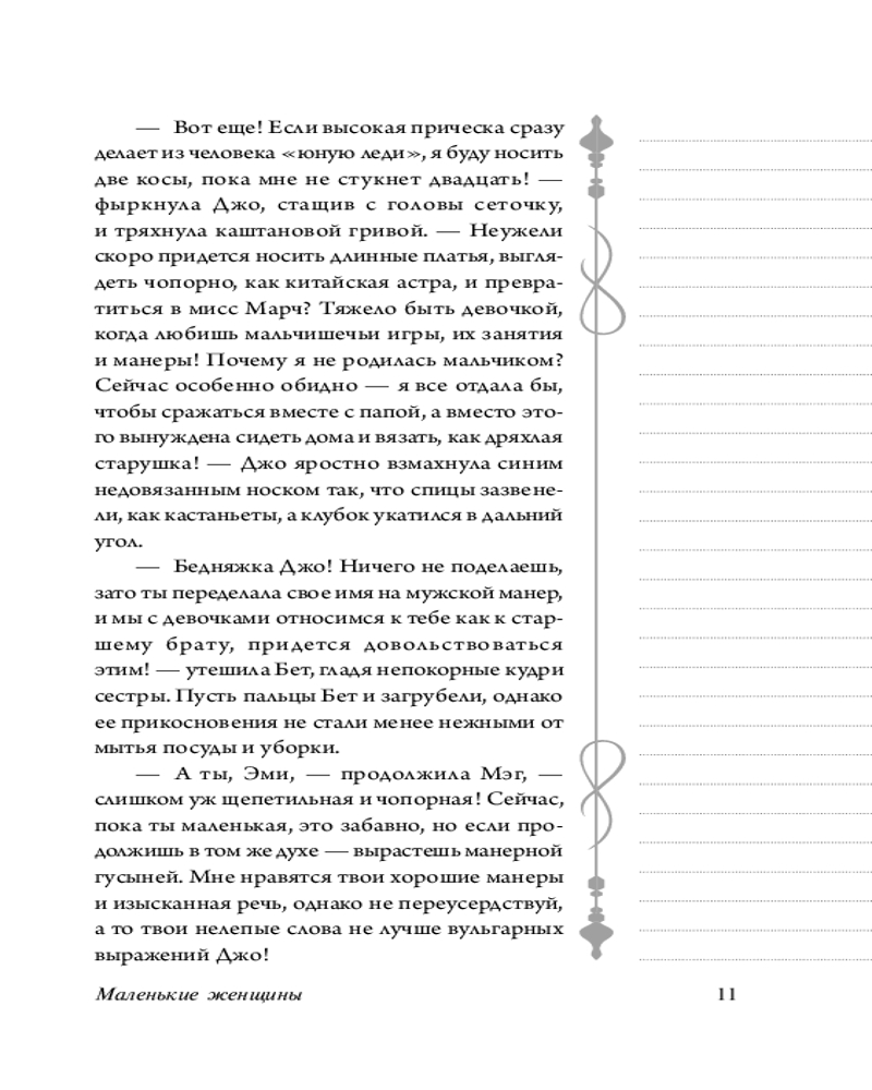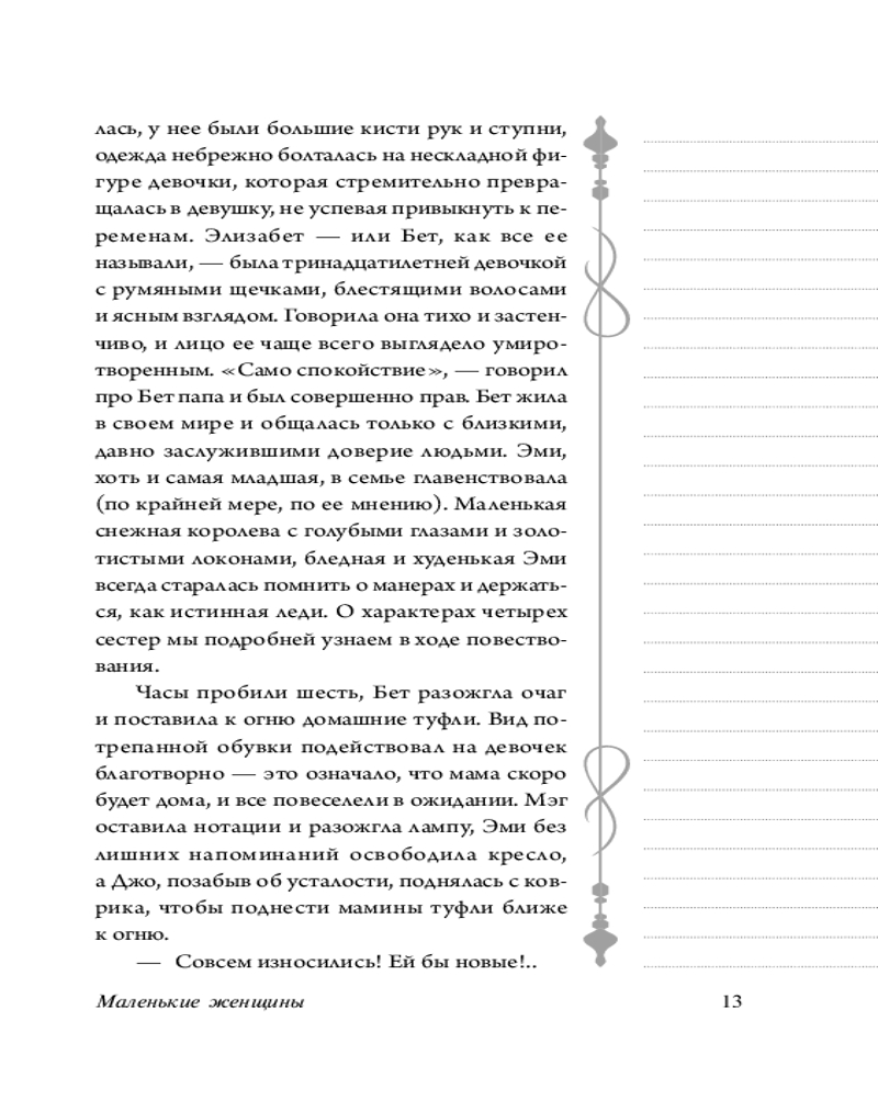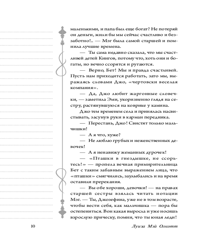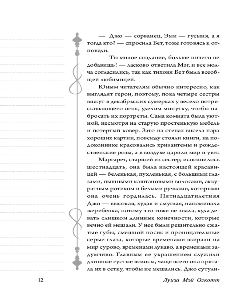 Серия: Записки на полях: классика для себя Далеко на Юге бушует Гражданская война. Отец семейства Марч ушел на фронт, а его жена и четыре дочери — добрая Мэг, непокорная Джо, кроткая Бет и мечтательная Эми — изо всех сил стараются не унывать и вести нормальный образ жизни. Несмотря на тяжелые времена, дни сестер Марч наполнены маленькими радостями: они рисуют, играют на фортепиано, пишут рассказы, заводят друзей. Вместе преодолевая трудности, девочки радуются успехам друг друга и лелеют мечты о лучшем будущем. Каждой из четырех сестер предстоит найти свое призвание и, конечно, впервые в жизни влюбиться... |