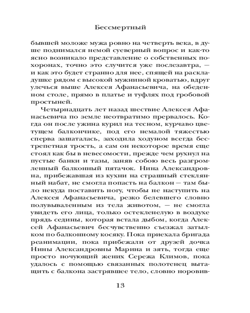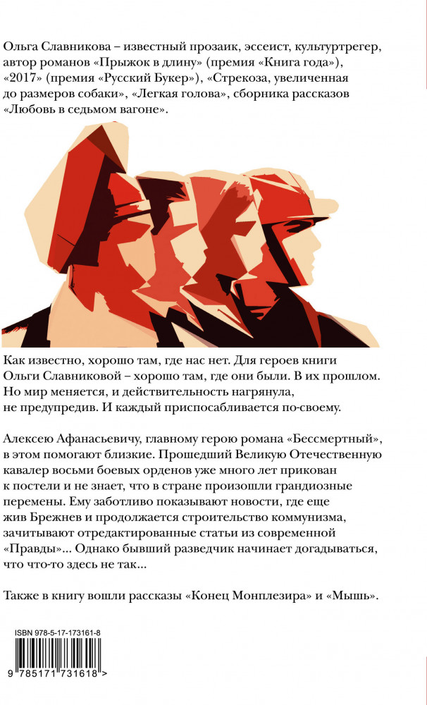 Серия: Новая русская классика Как известно, хорошо там, где нас нет. Для героев книги Ольги Славниковой — хорошо там, где они были. В их прошлом. Но мир меняется, и действительность нагрянула, не предупредив. И каждый приспосабливается по-своему. Алексею Афанасьевичу, главному герою романа «Бессмертный», в этом помогают близкие. Прошедший Великую Отечественную кавалер восьми боевых орденов уже много лет прикован к постели и не знает, что за последние пятнадцать лет в стране произошли грандиозные перемены. Ему заботливо показывают новости, где еще жив Брежнев и продолжается строительство коммунизма, зачитывают отредактированные статьи из современной «Правды»... Однако бывший разведчик начинает догадываться, что что-то здесь не так... Также в книгу вошли рассказы «Конец Монплезира» и «Мышь». |