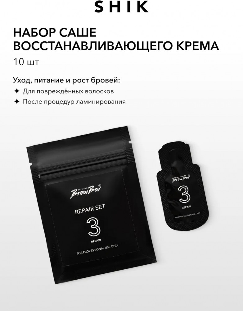 Brow Bar Shik Pro Набор кремов для восстановления бровей после коррекции и ламинирования «Repair Set №3»В данный момент этот товар отсутствует в продаже. Возможно, у нас найдется аналогичный или похожий товар здесь. Набор из 10 штук саше восстанавливающего крема Repair Set завершает процедуру ламинирования бровей. Сыворотка-концентрат глубоко питает и восстанавливает структуру волосков. За это отвечают 18 природных компонентов: натуральный комплекс от бетаина до экстракта ягод годжи ухаживает, снимает воспаление и способствует росту бровей. Средство подходит для профессионального и домашнего ухода. |