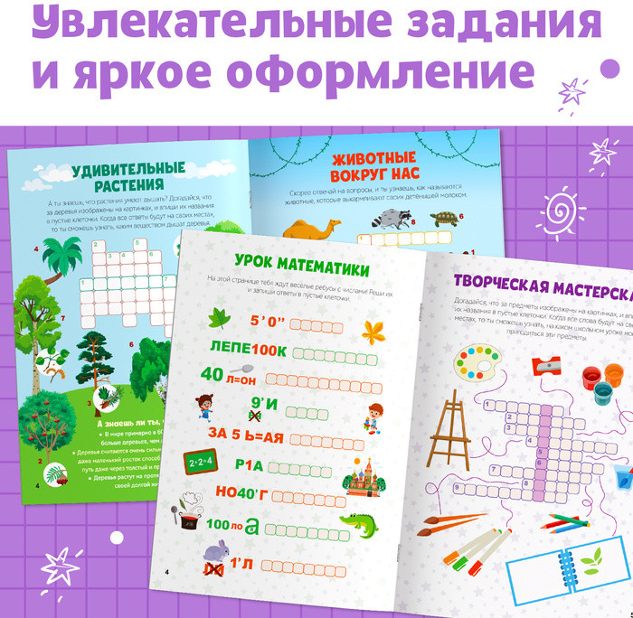 В книгах «Весёлые кроссворды» есть загадки, ребусы и головоломки на различную тематику: животные, окружающий мир, школа. Разгадывание кроссвордов благотворно влияет на развитие логического мышления, тренирует память и расширяет кругозор. Набор «Весёлые кроссворды» представлен 6 книгами разной тематики: «Алфавит», «Животные», «Здравствуй, школа!», «Окружающий мир», «Разгадай нас», «Ребусы и головоломки». Рекомендовано для детей от 5 лет. |