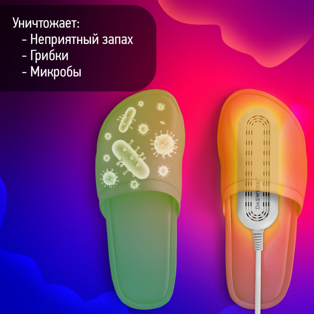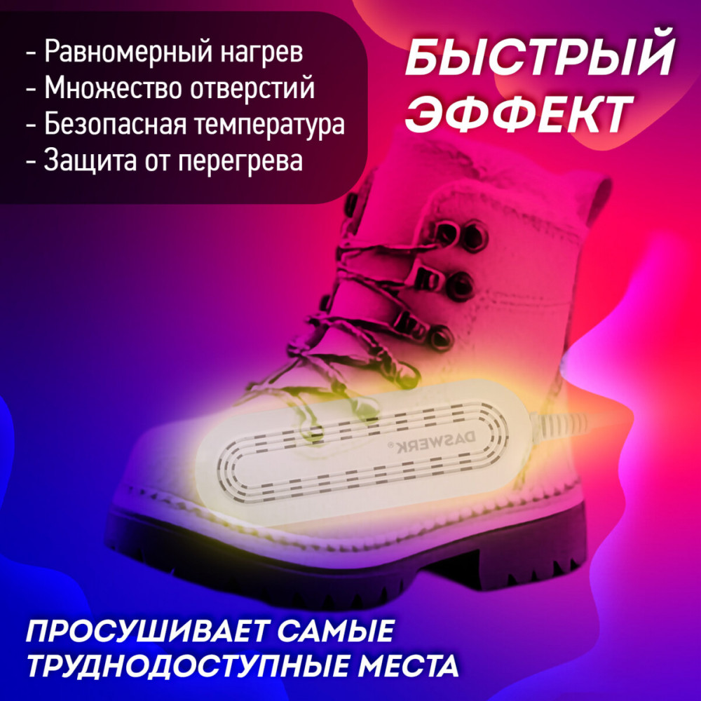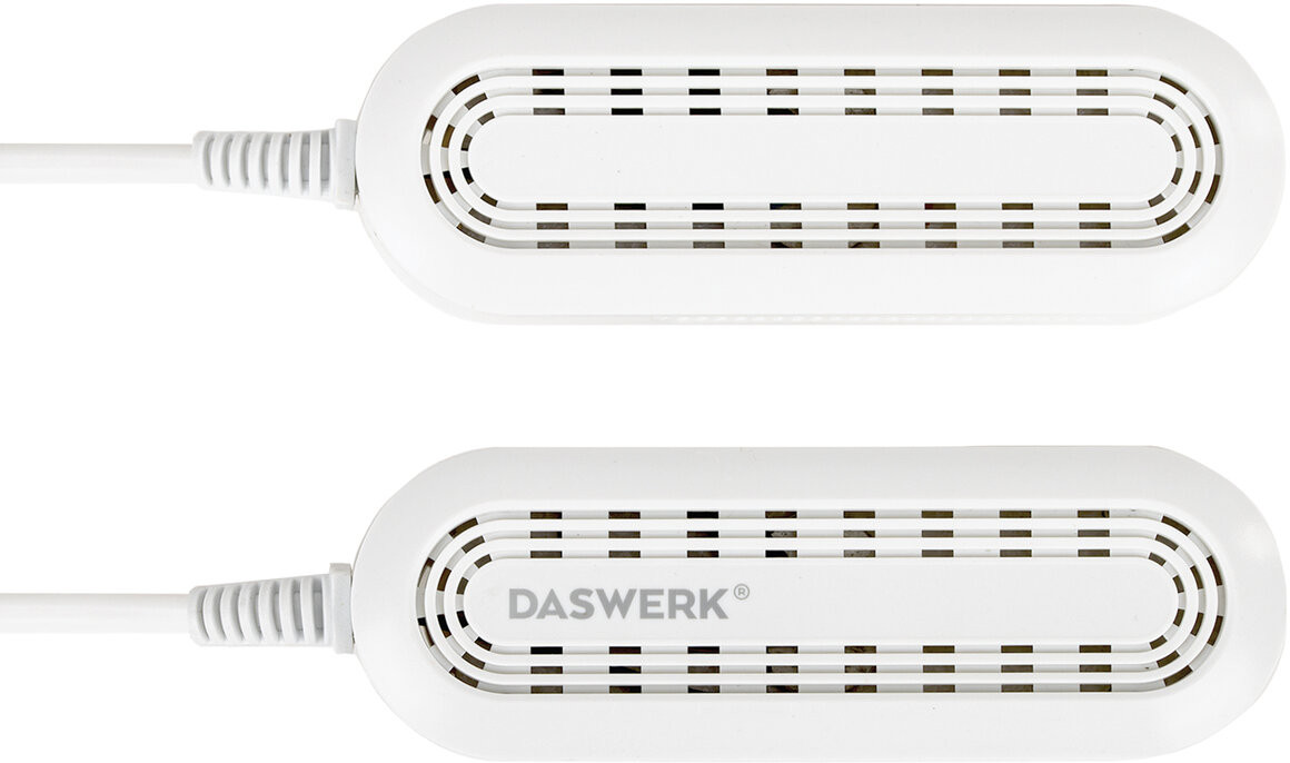 Сушилка для обуви Daswerk создана для бережного и безопасного ухода за обувью. Особая технология нагрева уничтожает неприятный запах и дезинфицирует обувь, а эргономичная форма позволяет просушить даже самые труднодоступные места.