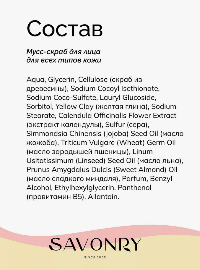 Savonry Мусс-скраб для лицаВ данный момент этот товар отсутствует в продаже. Возможно, у нас найдется аналогичный или похожий товар здесь. Очередная новинка от «Savonry» — мусс-скраб для лица. Нежная консистенция мусса легко наносится на кожу, деликатно очищает, образуя мягкую пенку. Мелкие скрабирующие частички,не травмируя кожу, полностью удаляют ороговевшие клетки, тем самым ускоряя обменные процессы в клетках эпидермиса. Мусс-скраб легко смывается водой, оставляя на коже тонкий аромат. Сбалансированный состав мусса позволяет использовать его для любого типа кожи. Главные компоненты скраба — это сера и желтая глина, богатая железом и калием. Желтая глина широко известна своими тонизирующими свойствами. Также она является отличным адсорбентом. Позаботьтесь о красоте кожи вместе с мусс-скрабом от Savonry! Ведь глубокое очищение и питание — залог красивой кожи! |