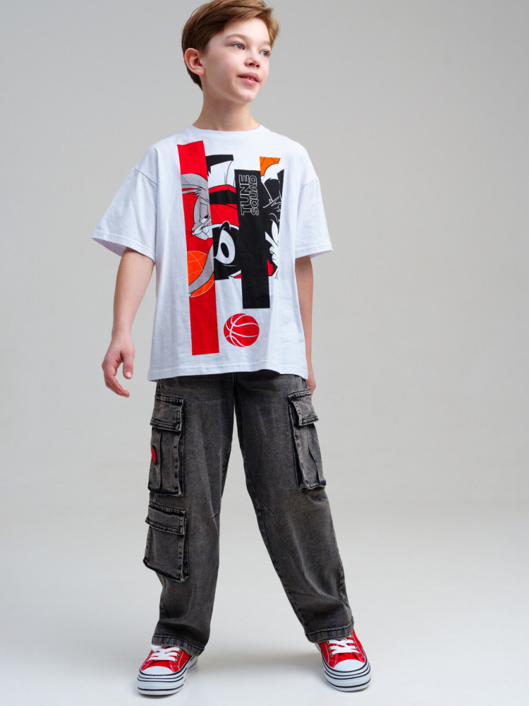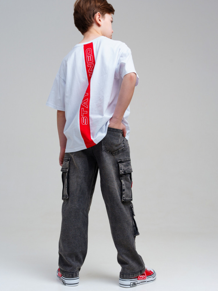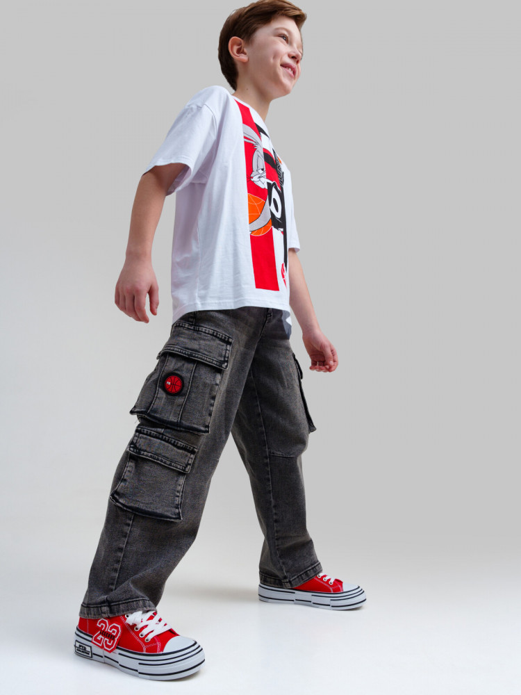 Джинсы для мальчика подростка. BAGGY FIT - модный расслабленный крой. Средняя посадка. Внутренняя утяжка. Застежка на молнию и болт. Накладные карго-карманы. Принт и силиконовый патч на карманах. Модная кислотная варка.