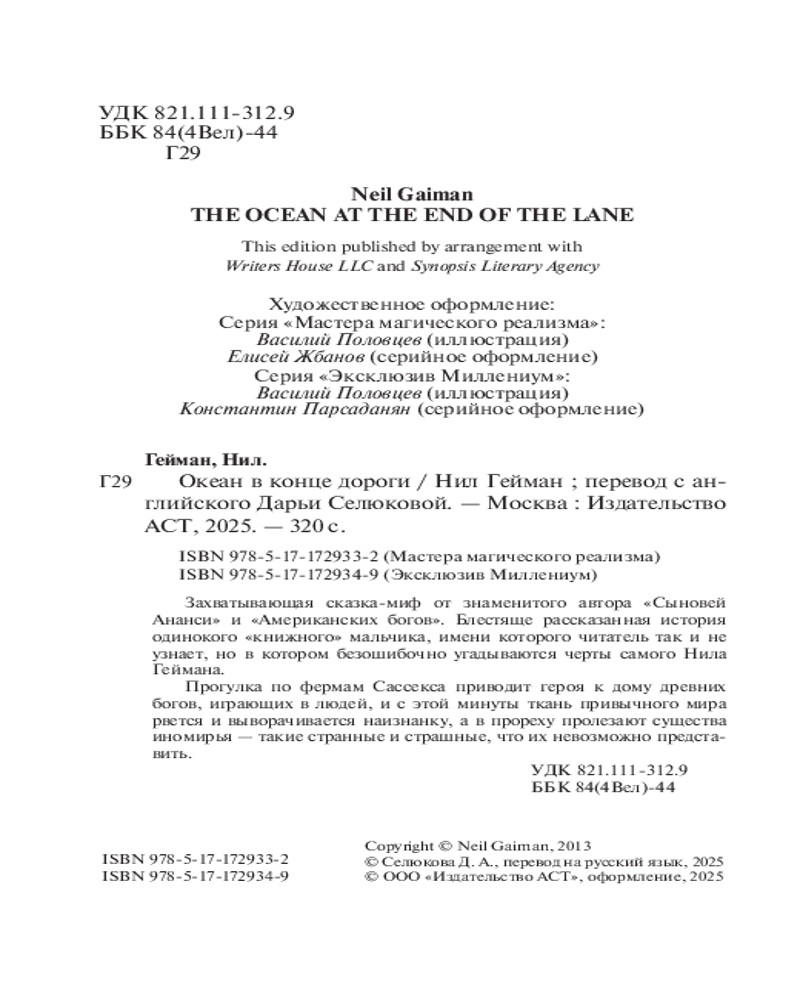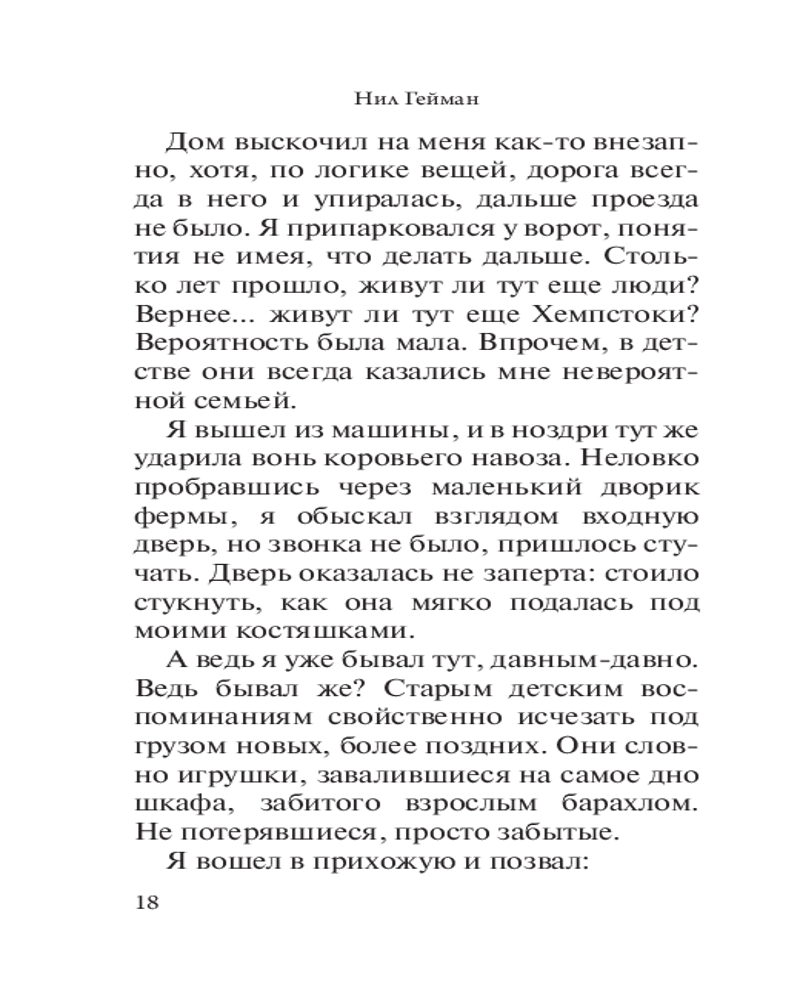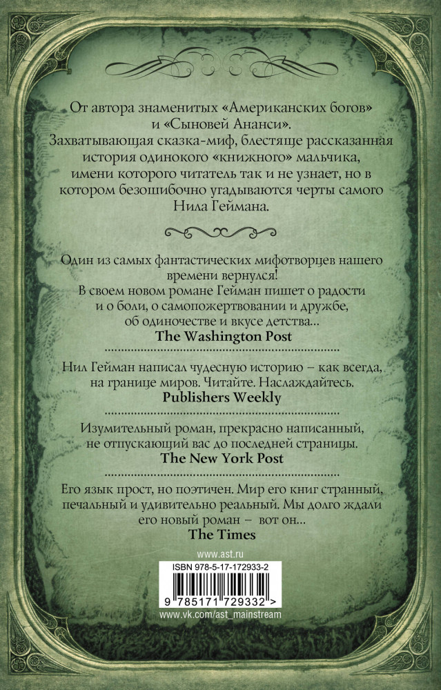 Серия: Мастера магического реализма (покет) Захватывающая сказка-миф от знаменитого автора «Сыновей Ананси» и «Американских богов». Блестяще рассказанная история одинокого «книжного» мальчика, имени которого читатель так и не узнает, но в котором безошибочно угадываются черты самого Нила Геймана. Прогулка по фермам Сассекса приводит героя к дому древних богов, играющих в людей, и с этой минуты ткань привычного мира рвется и выворачивается наизнанку, а в прореху пролезают существа иномирья — такие странные и страшные, что их невозможно представить. |