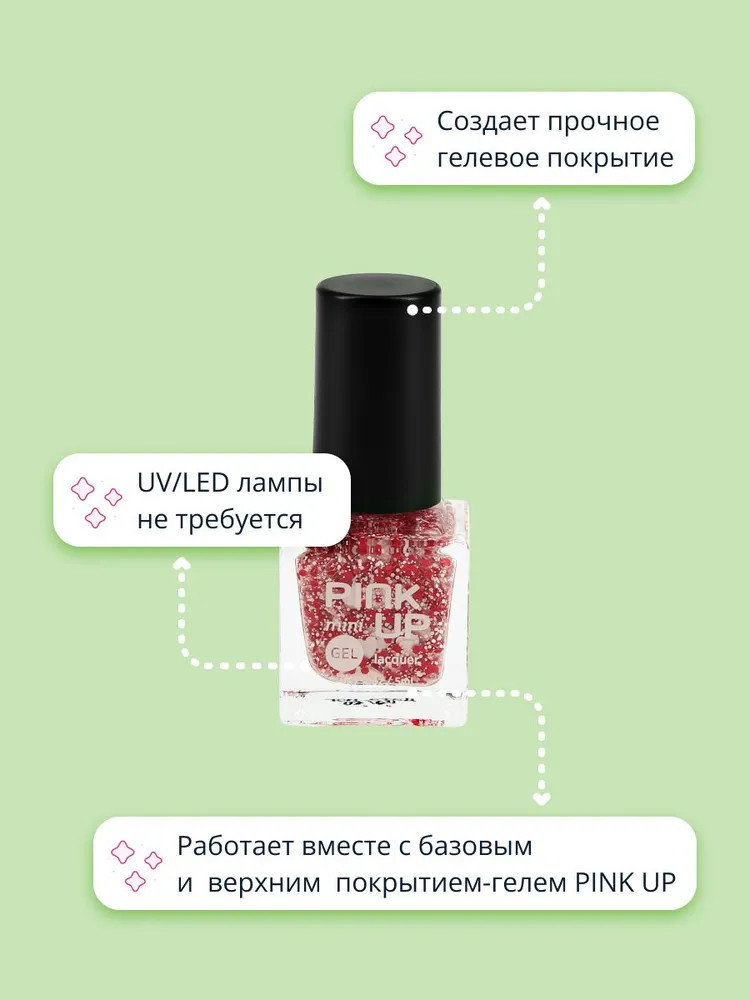 Лак для ногтей Pink Up Mini Gel с эффектом геля в мини-формате. Гель-лак для ногтей работает вместе c базовым и верхним топовым покрытием-гелем Pink Up, создавая прочное гелевое покрытие.