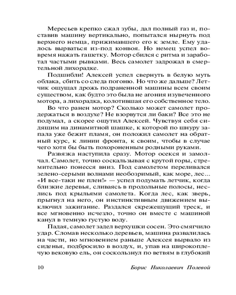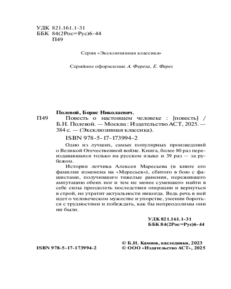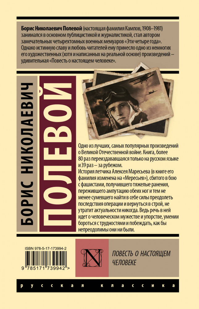 Серия: Эксклюзивная классика (Лучшее) Одно из лучших, самых популярных произведений о Великой Отечественной войне. Книга, более восьмидесяти раз переиздававшаяся только на русском языке, и 39 раз — за рубежом. История летчика Алексея Маресьева (в книге его фамилия изменена на «Мересьев»), сбитого в бою с фашистами, получившего тяжелые ранения, пережившего ампутацию обеих ног и, тем не менее, сумевшего найти в себе силы преодолеть последствия операции и вернуться в строй, не утратит актуальности никогда. Ведь речь в ней идет о человеческом мужестве и упорстве, умении бороться с трудностями и побеждать, как бы непреодолимы они ни были. |