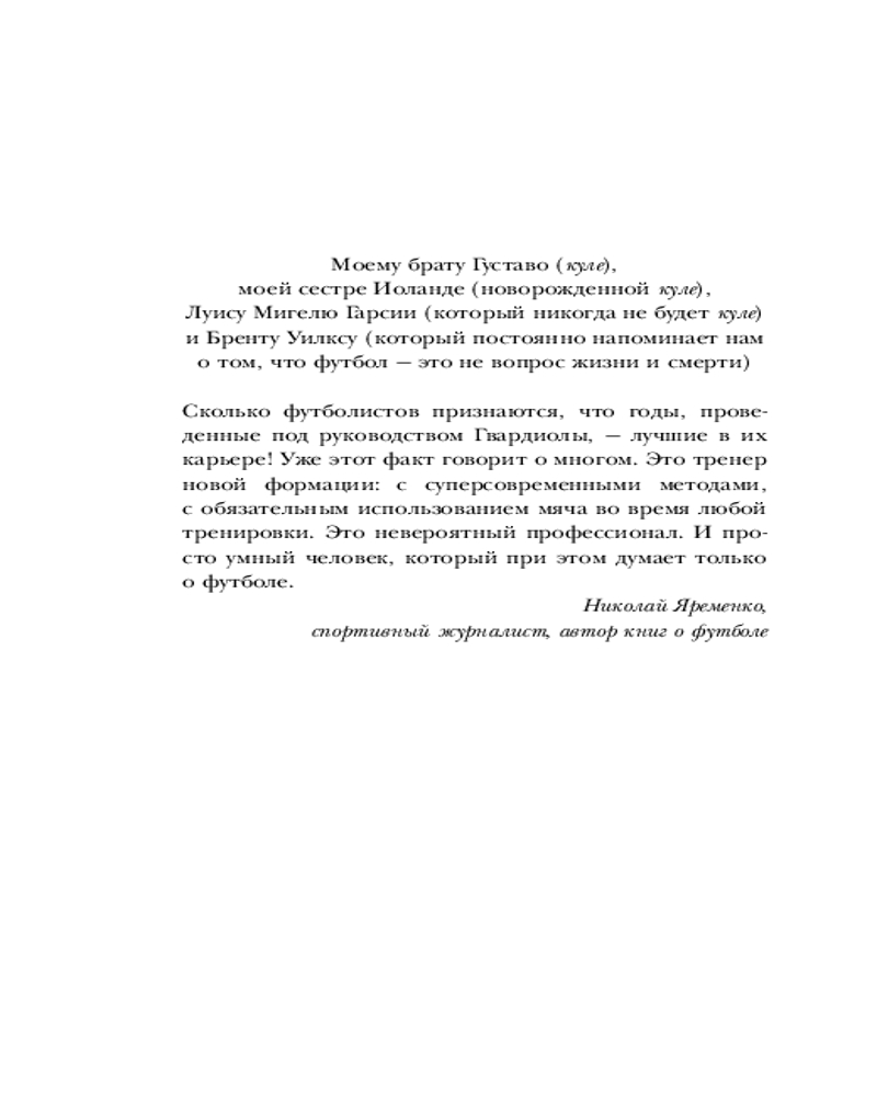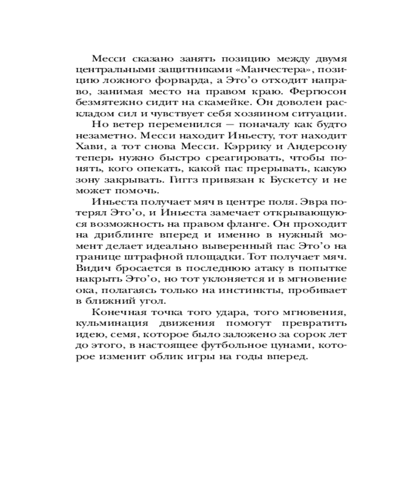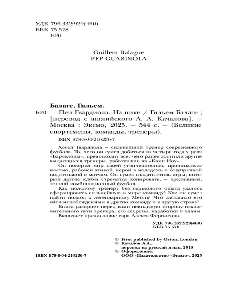 Серия: Великие спортсмены, команды, тренеры (карманный формат) Хосеп Гвардиола — сильнейший тренер современного футбола. То, чего он сумел добиться за четыре года у руля «Барселоны», превосходит все, чего ранее достигли другие выдающиеся тренеры, работавшие на «Камп Ноу». Он покорил мир своей утонченностью, проницательностью, рабочей этикой, верой в молодежь и безупречной подготовкой к матчам. Он сумел создать стиль игры, который другие клубы стремятся копировать, — зрелищный, тонкий комбинационный футбол. |