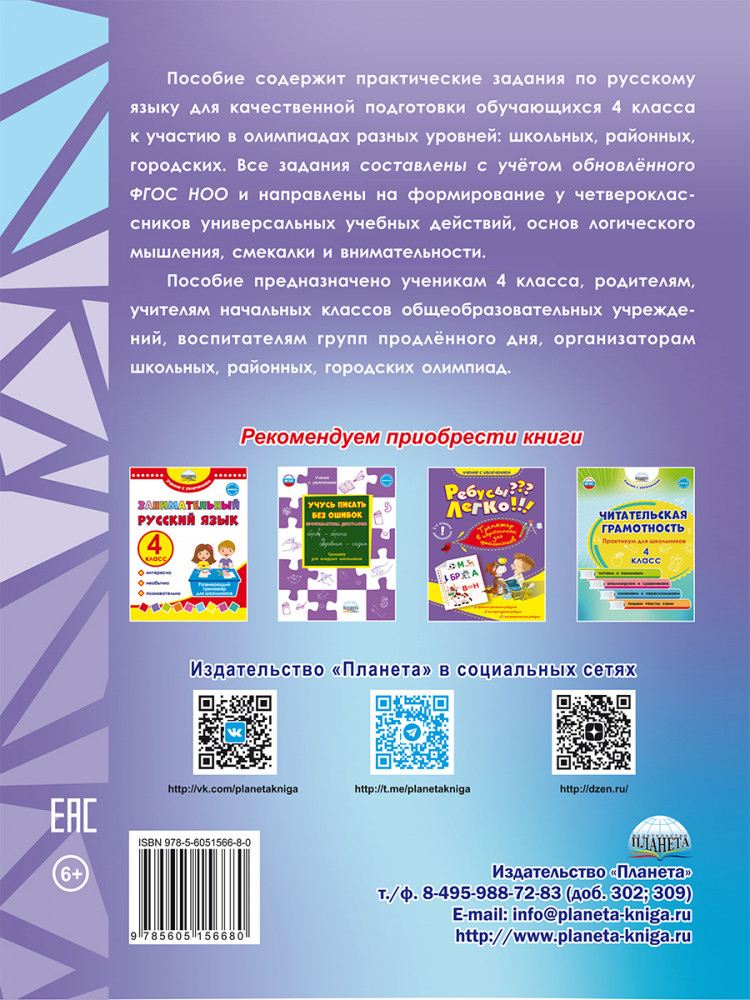 Серия: Готовимся к олимпиадам Пособие содержит практические задания по русскому языку для качественной подготовки обучающихся 4 класса к участию в олимпиадах разных уровней: школьных, районных, городских. Все задания составлены с учётом обновлённого ФГОС НОО и направлены на формирование у четвероклассников универсальных учебных действий, основ логического мышления, смекалки и внимательности. Пособие предназначено ученикам 4 класса, родителям, учителям начальных классов общеобразовательных учреждений, воспитателям групп продлённого дня, организаторам школьных, районных, городских олимпиад. |