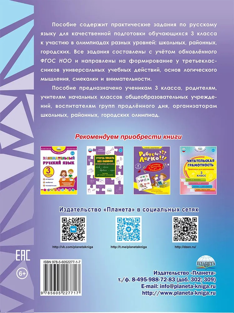 Серия: Готовимся к олимпиадам Пособие содержит практические задания по русскому языку для качественной подготовки обучающихся 3 класса к участию в олимпиадах разных уровней: школьных, районных, городских. Все задания составлены с учётом обновлённого ФГОС НОО и направлены на формирование у третьеклассников универсальных учебных действий, основ логического мышления, смекалки и внимательности. |