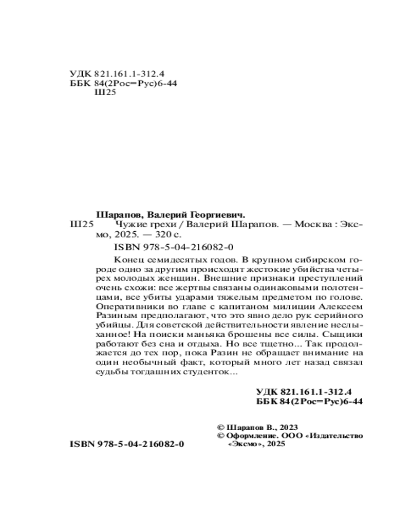 Конец семидесятых годов. В крупном сибирском городе одно за другим происходят жестокие убийства четырех молодых женщин. Внешние признаки преступлений очень схожи: все жертвы связаны одинаковыми полотенцами, все убиты ударами тяжелым предметом по голове. Оперативники во главе с капитаном милиции Алексеем Разиным предполагают, что это явно дело рук серийного убийцы. Для советской действительности явление неслыханное! На поиски маньяка брошены все силы. Сыщики работают без сна и отдыха. Но все тщетно... Так продолжается до тех пор, пока Разин не обращает внимание на один необычный факт, который много лет назад связал судьбы тогдашних студенток...