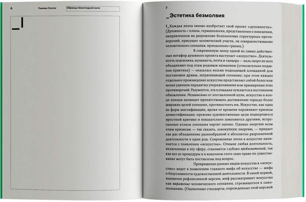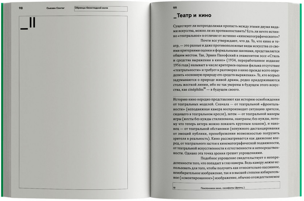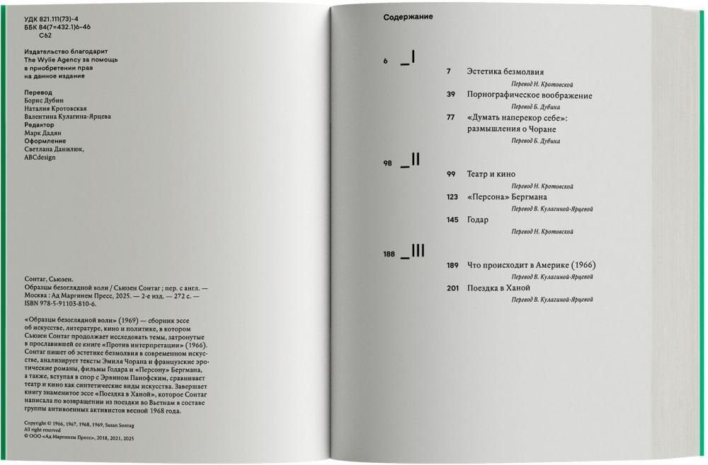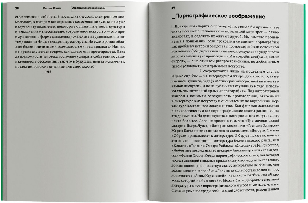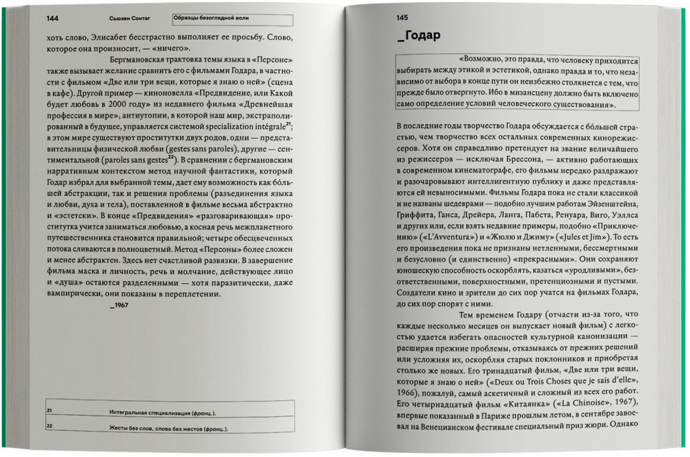 «Образцы безоглядной воли» (1969) — сборник эссе об искусстве, литературе, кино и политике, в котором Сьюзен Сонтаг продолжает исследовать темы, затронутые в прославившей ее книге «Против интерпретации» (1966). Сонтаг пишет об эстетике безмолвия в современном искусстве, анализирует тексты Эмиля Чорана и французские эротические романы, фильмы Годара и «Персону» Бергмана, а также, вступая в спор с Эрвином Панофским, сравнивает театр и кино как синтетические виды искусства. Завершает книгу знаменитое эссе «Поездка в Ханой», которое Сонтаг написала по возвращении из поездки во Вьетнам в составе группы антивоенных активистов весной 1968 года. |