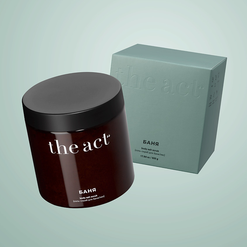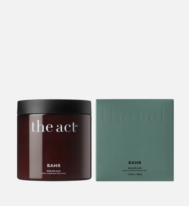 Соль-скраб для бани The Act с ароматом трав и хвойного леса. Соляной пилинг для тела обновляет, стимулирует обменные процессы и дарит сакральный опыт расслабления и эмоционального перерождения в атмосфере древних традиций парения в русской бане.