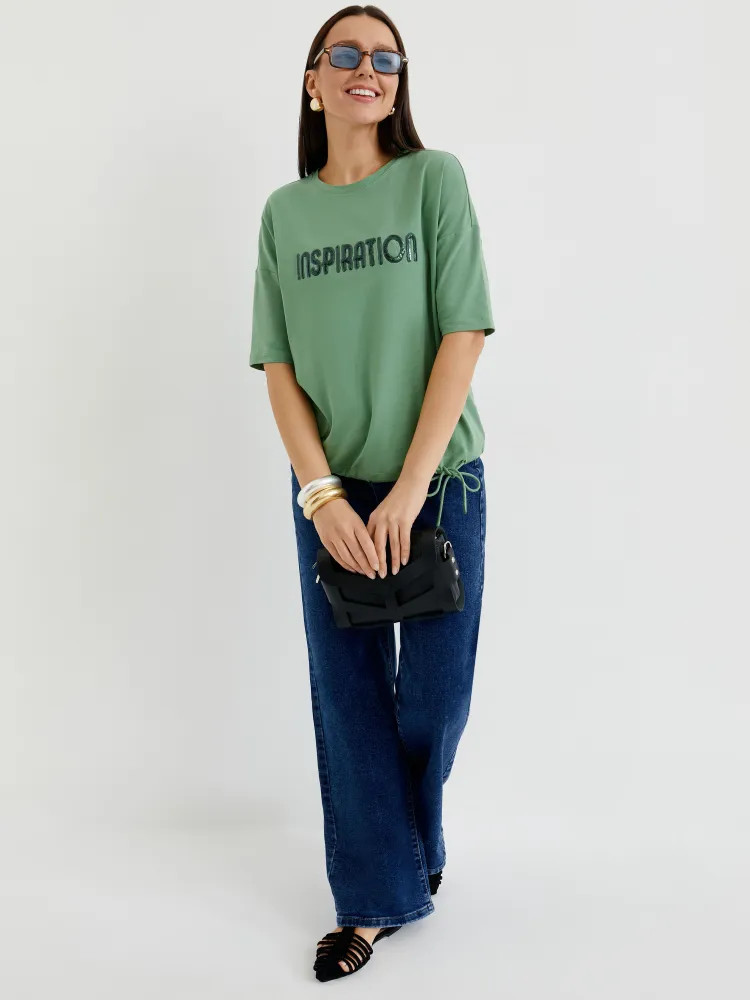 Представляем вам стильную женскую футболку, идеально подходящую для повседневной носки. Эта футболка — отличный выбор для создания модного образа, который подчеркнет вашу индивидуальность и комфорт. Выполненная из высококачественных материалов, она обеспечивает отличную воздухопроницаемость и мягкость на ощупь. Подходит для девушек с различными фигурами, предлагая свободный и удобный крой, который позволяет чувствовать себя уверенно в любых ситуациях. Футболка станет отличным дополнением к вашему гардеробу и подойдет как для прогулок по городу, так и для отдыха на природе.