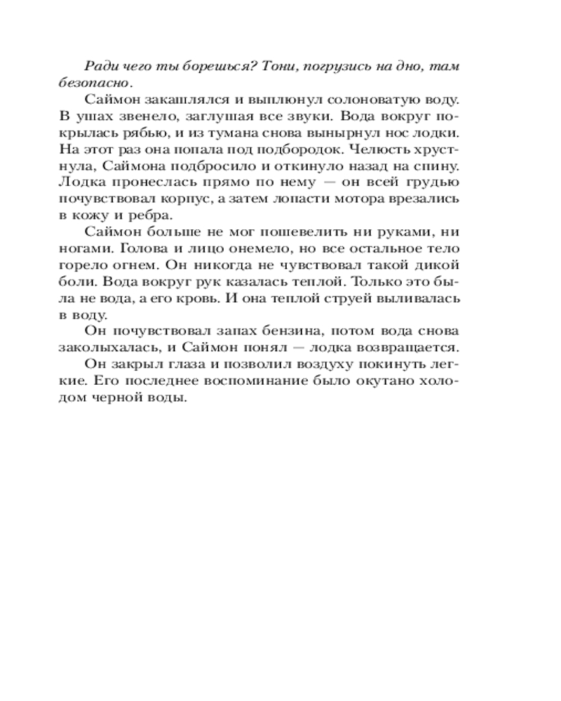 Серия: Новый мировой триллер (м) Тело молодого мужчины найдено в водохранилище «Черные пески». Власти сразу признают это всего лишь несчастным случаем, но Кейт Маршалл и ее помощник Тристан Харпер уверены в обратном. Что погибший делал в водоеме посреди ночи? Он был отличным пловцом, как он мог утонуть? С каждым шагом расследование приоткрывает все больше темных тайн. |
