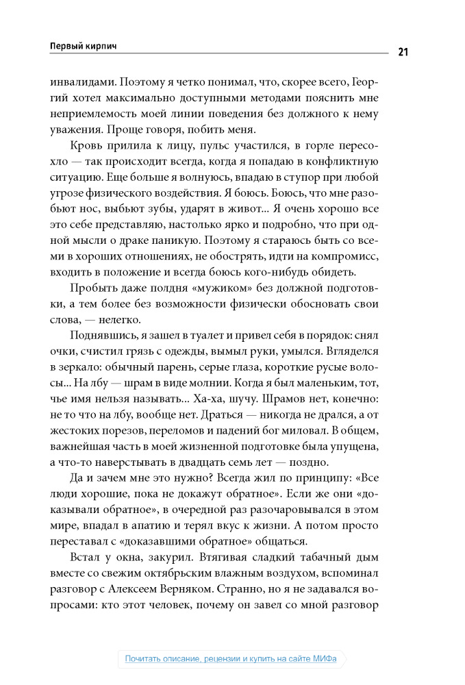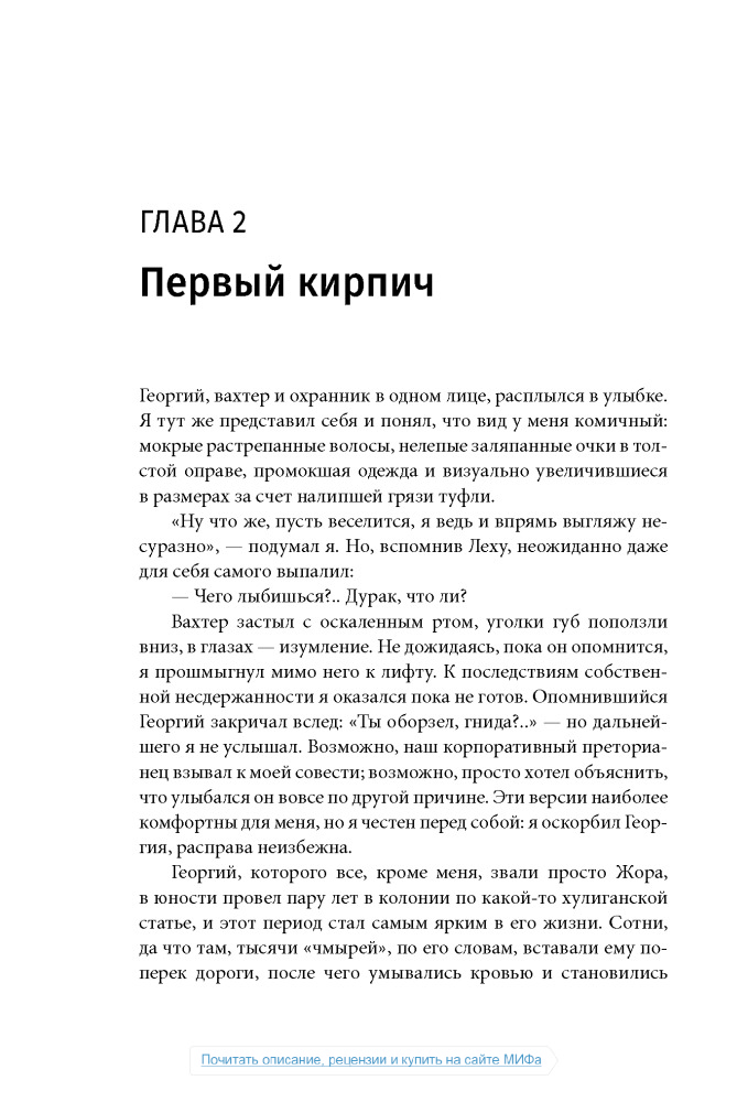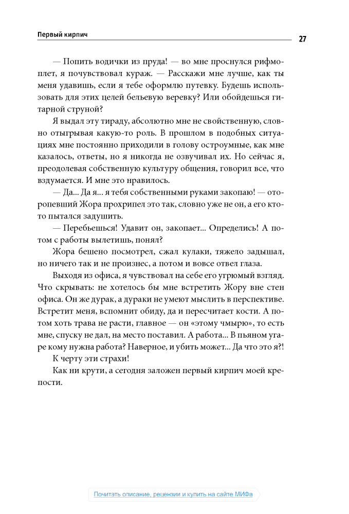 Данияра знаю не так много, сотрудничаем в части интернет-конференций, его kaznetmedia трижды подряд в 2011-2013 годах становилаcь лучшей веб-студией страны по версии «Национальной интернет-премии AWARD.KZ». Как писатель Данияр открылся для меня впервые. Скажу честно на первых главах хотел бросить читать – слог совсем не мой, резанный, знаки препинания ставятся по каким-то совсем не моим правилам. Но постепенно затянуло. Что такое кирпичи – это цели, шажки, который делает главный герой Сергей Резвей на пути к своему совершенствованию. Кто такое Сергей – рядовой рекламщик медиахолдига, неуверенный в себе, без ответной любви в жизни и удовлетворённости в работе, инфальтивен. Герой борется, ему помогают, он страдает, опять борется, ты начинаешь ему сопереживать и книга проглатывается за пару вечеров. В сухом остатке хеппи-энд и одна из лучших книг по мотивации и поднятию боевого духа. Автор пиши еще!